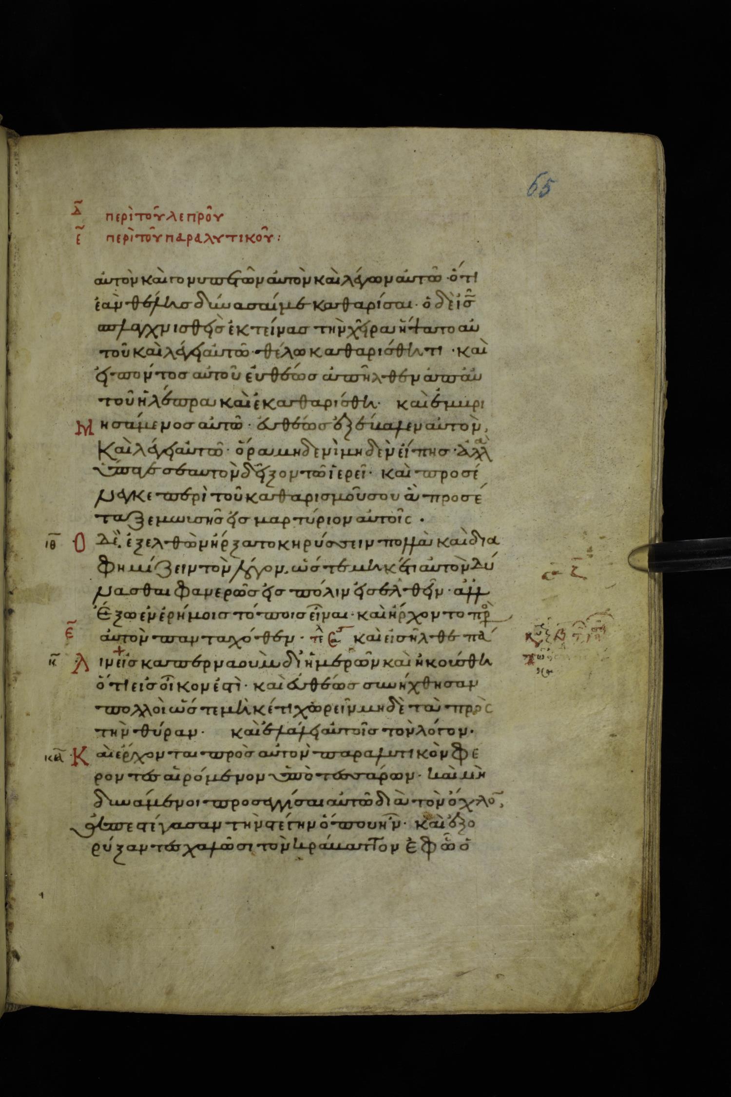 Twelfth century minuscule of the Gospels on parchment; 195 leaves, 1 column, 25 lines per column. Images were taken at the National Library of Greece in Athens.