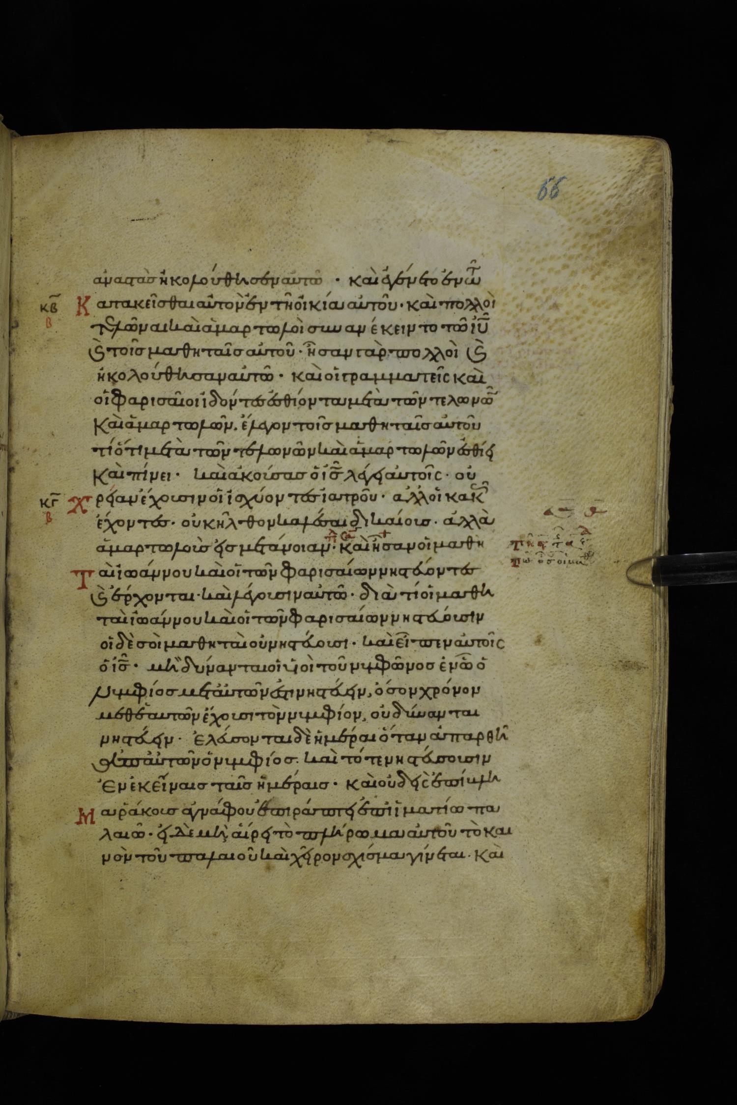 Twelfth century minuscule of the Gospels on parchment; 195 leaves, 1 column, 25 lines per column. Images were taken at the National Library of Greece in Athens.