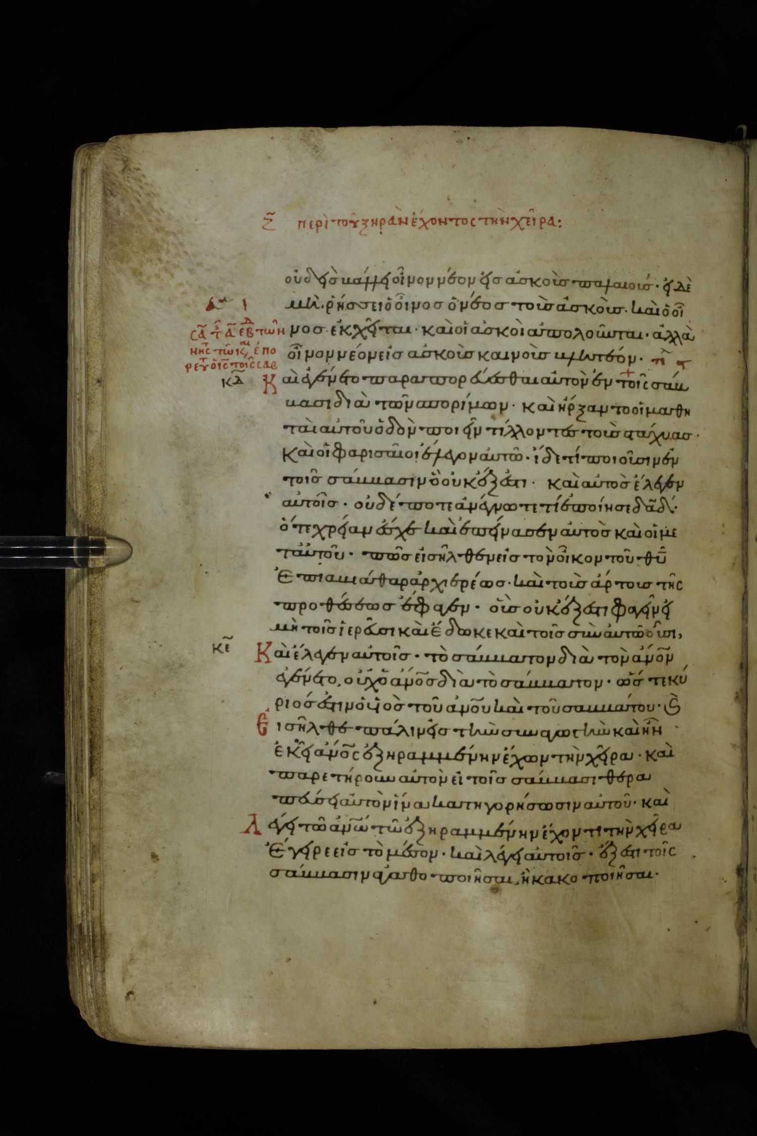 Twelfth century minuscule of the Gospels on parchment; 195 leaves, 1 column, 25 lines per column. Images were taken at the National Library of Greece in Athens.