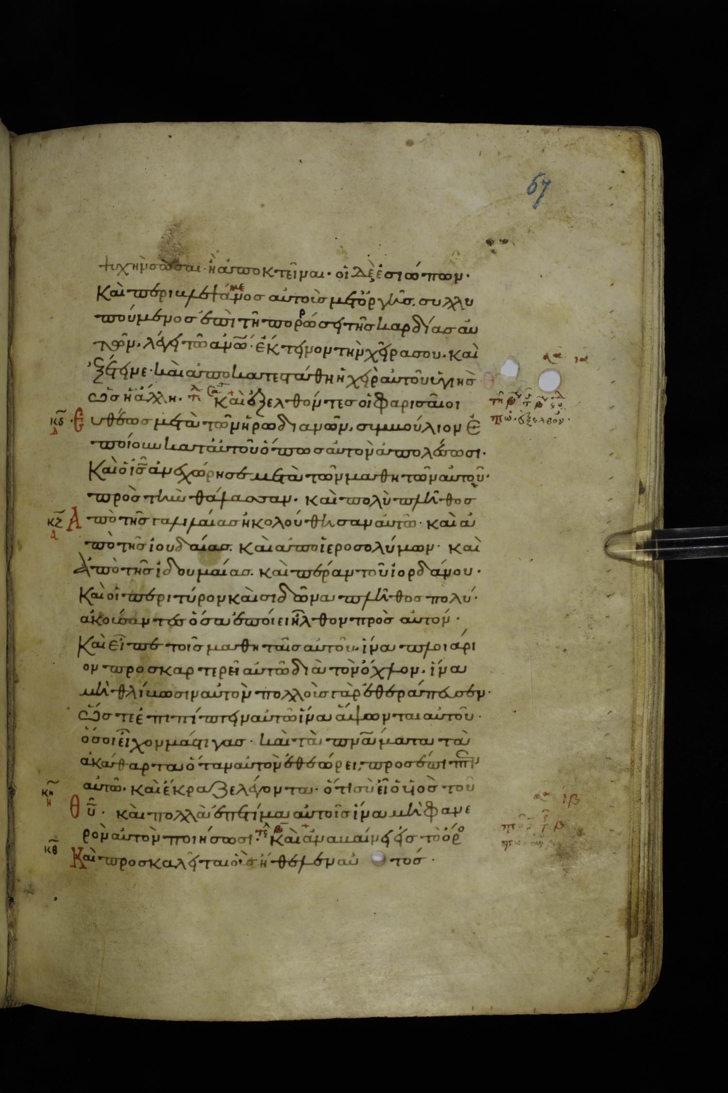 Twelfth century minuscule of the Gospels on parchment; 195 leaves, 1 column, 25 lines per column. Images were taken at the National Library of Greece in Athens.