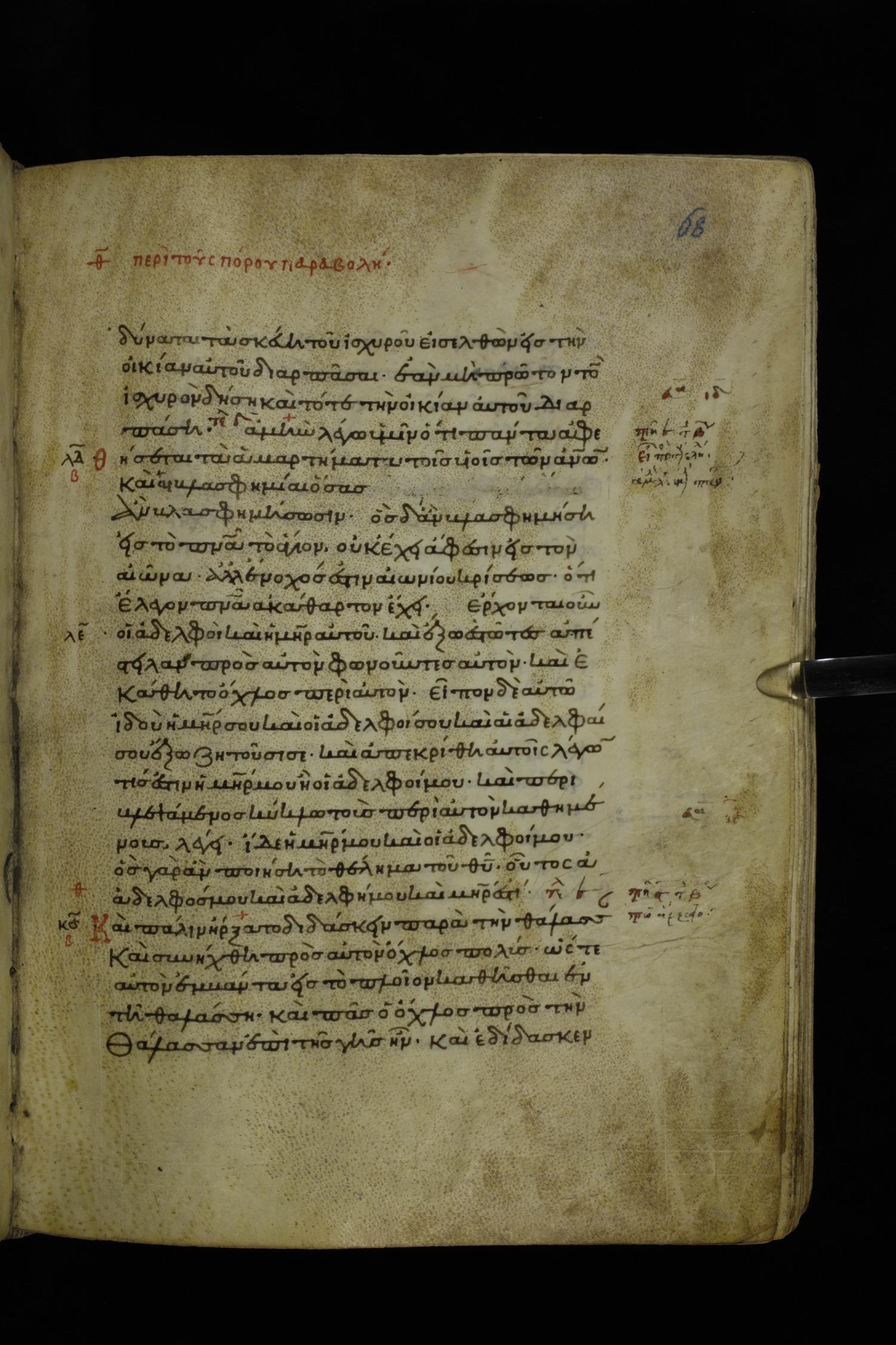 Twelfth century minuscule of the Gospels on parchment; 195 leaves, 1 column, 25 lines per column. Images were taken at the National Library of Greece in Athens.