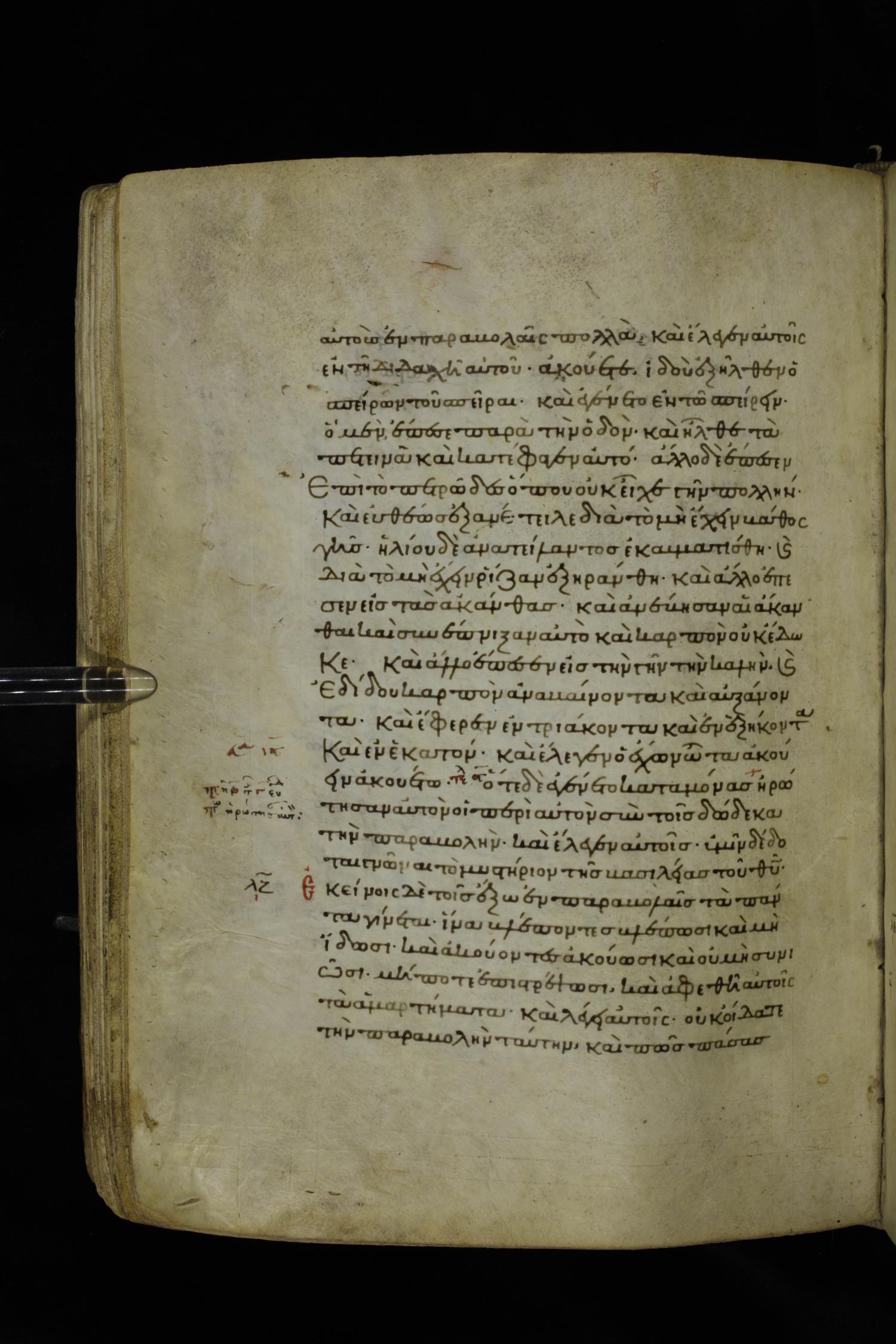 Twelfth century minuscule of the Gospels on parchment; 195 leaves, 1 column, 25 lines per column. Images were taken at the National Library of Greece in Athens.
