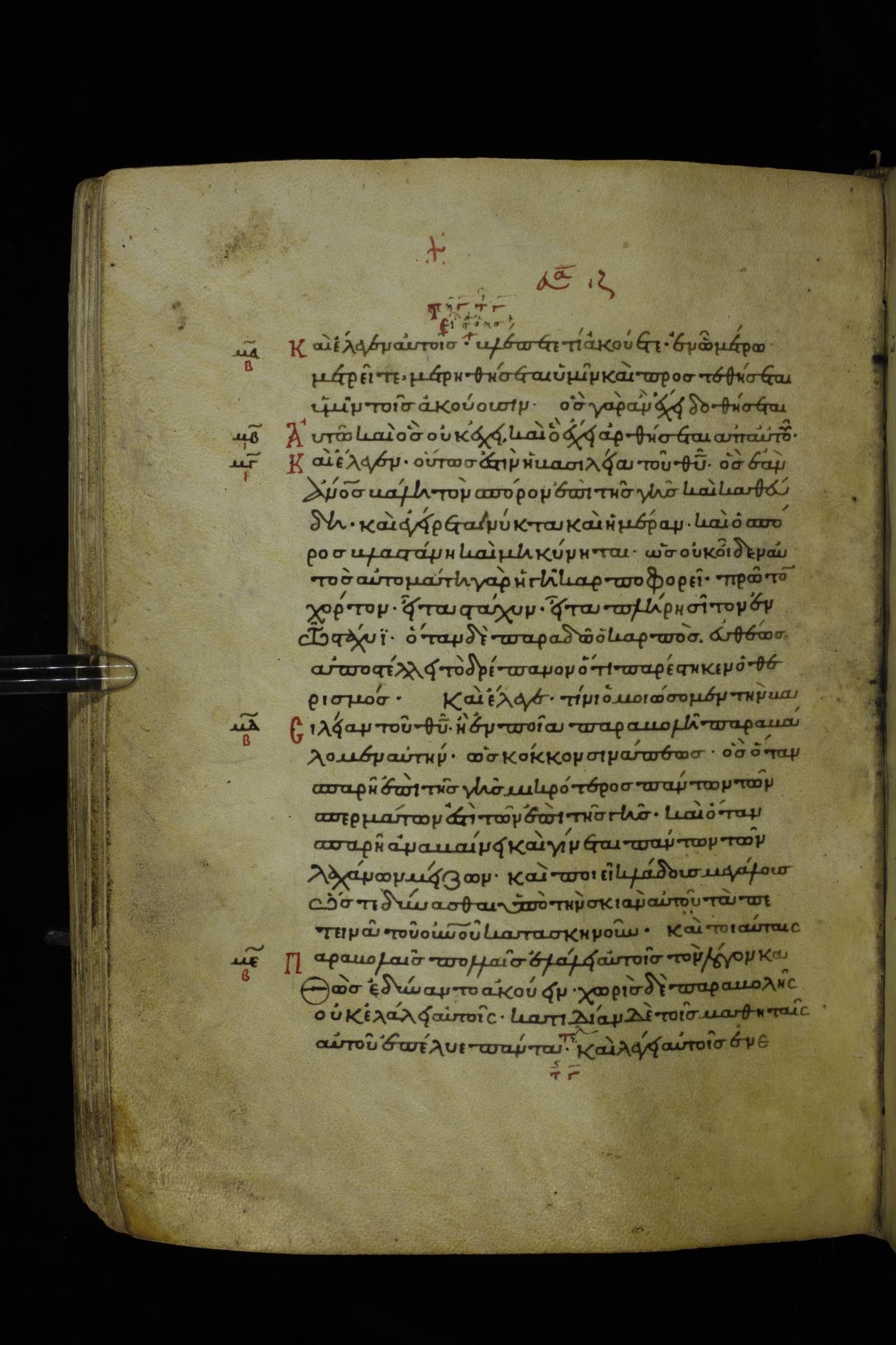 Twelfth century minuscule of the Gospels on parchment; 195 leaves, 1 column, 25 lines per column. Images were taken at the National Library of Greece in Athens.