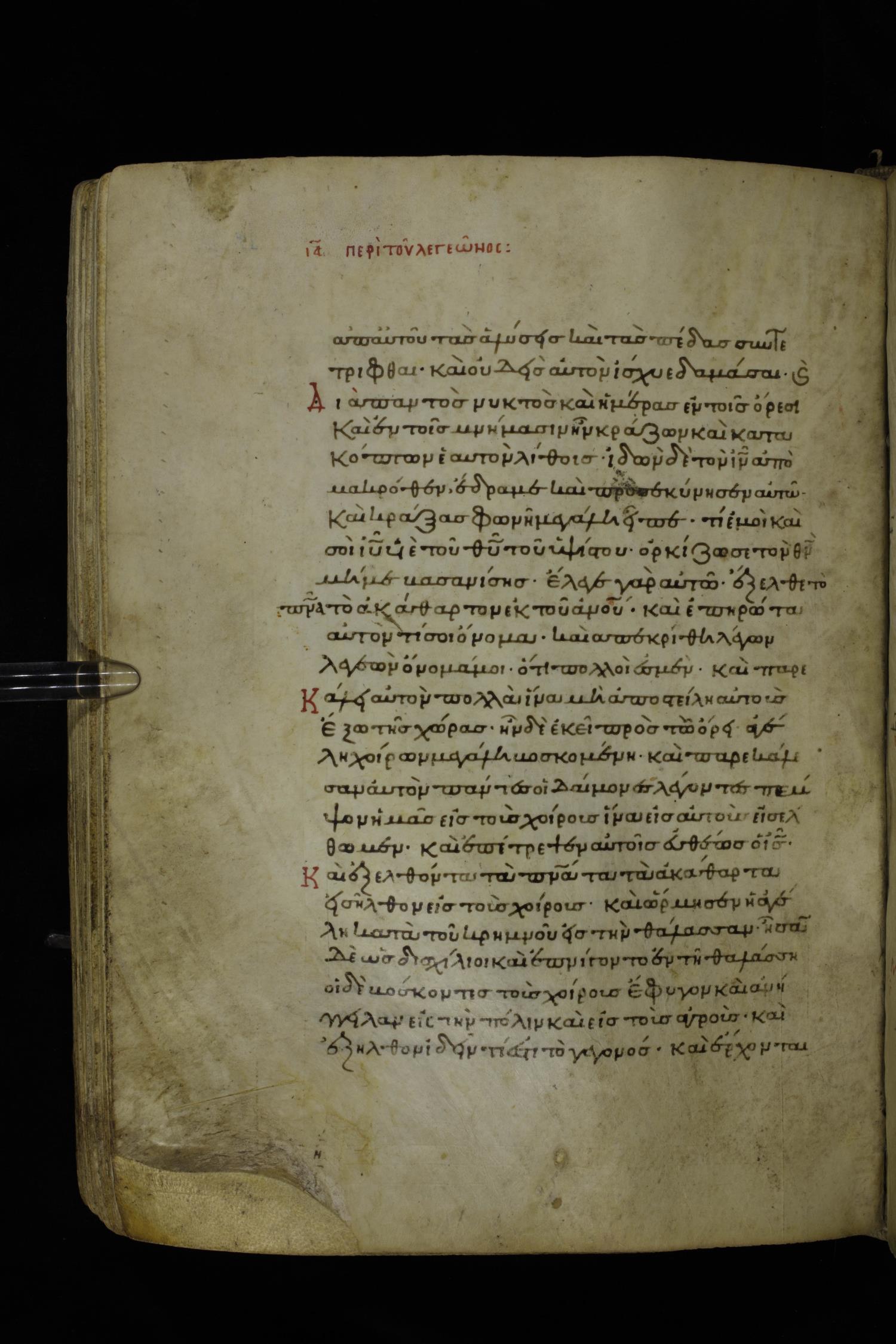 Twelfth century minuscule of the Gospels on parchment; 195 leaves, 1 column, 25 lines per column. Images were taken at the National Library of Greece in Athens.