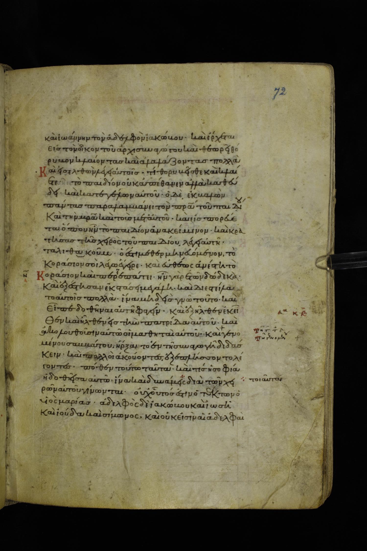 Twelfth century minuscule of the Gospels on parchment; 195 leaves, 1 column, 25 lines per column. Images were taken at the National Library of Greece in Athens.