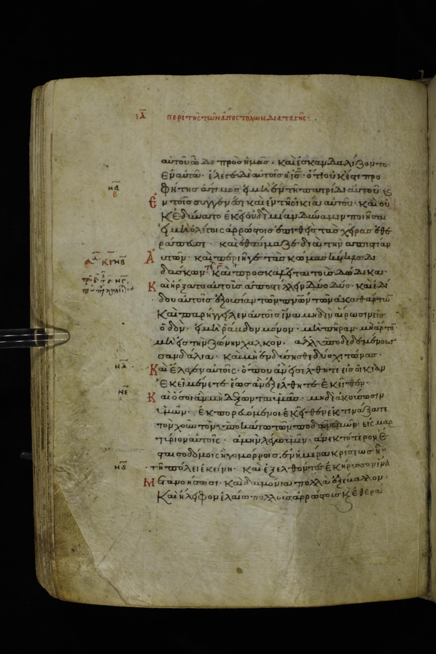 Twelfth century minuscule of the Gospels on parchment; 195 leaves, 1 column, 25 lines per column. Images were taken at the National Library of Greece in Athens.