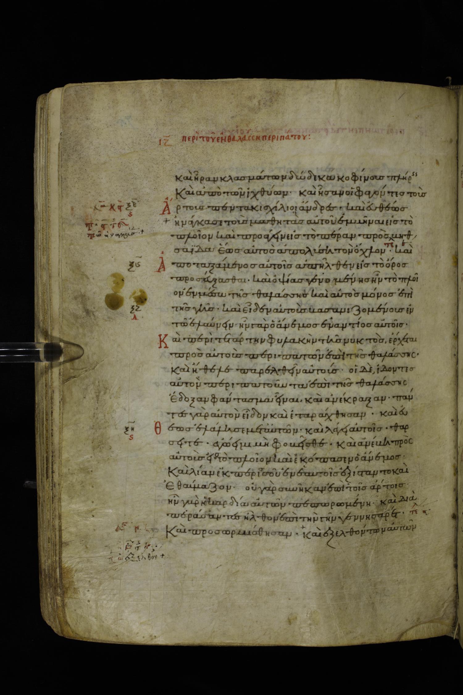 Twelfth century minuscule of the Gospels on parchment; 195 leaves, 1 column, 25 lines per column. Images were taken at the National Library of Greece in Athens.