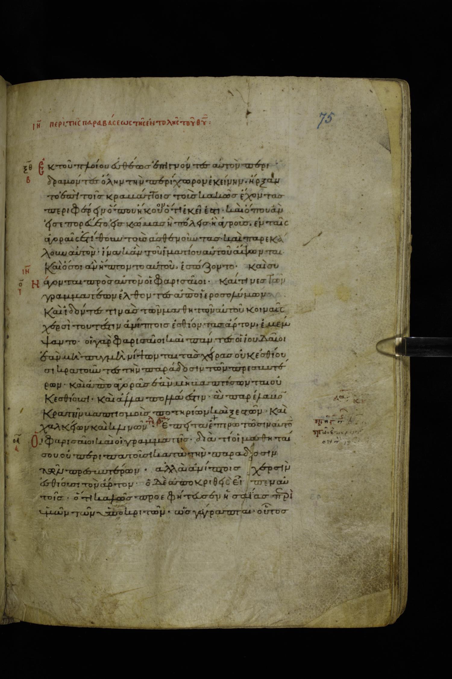 Twelfth century minuscule of the Gospels on parchment; 195 leaves, 1 column, 25 lines per column. Images were taken at the National Library of Greece in Athens.
