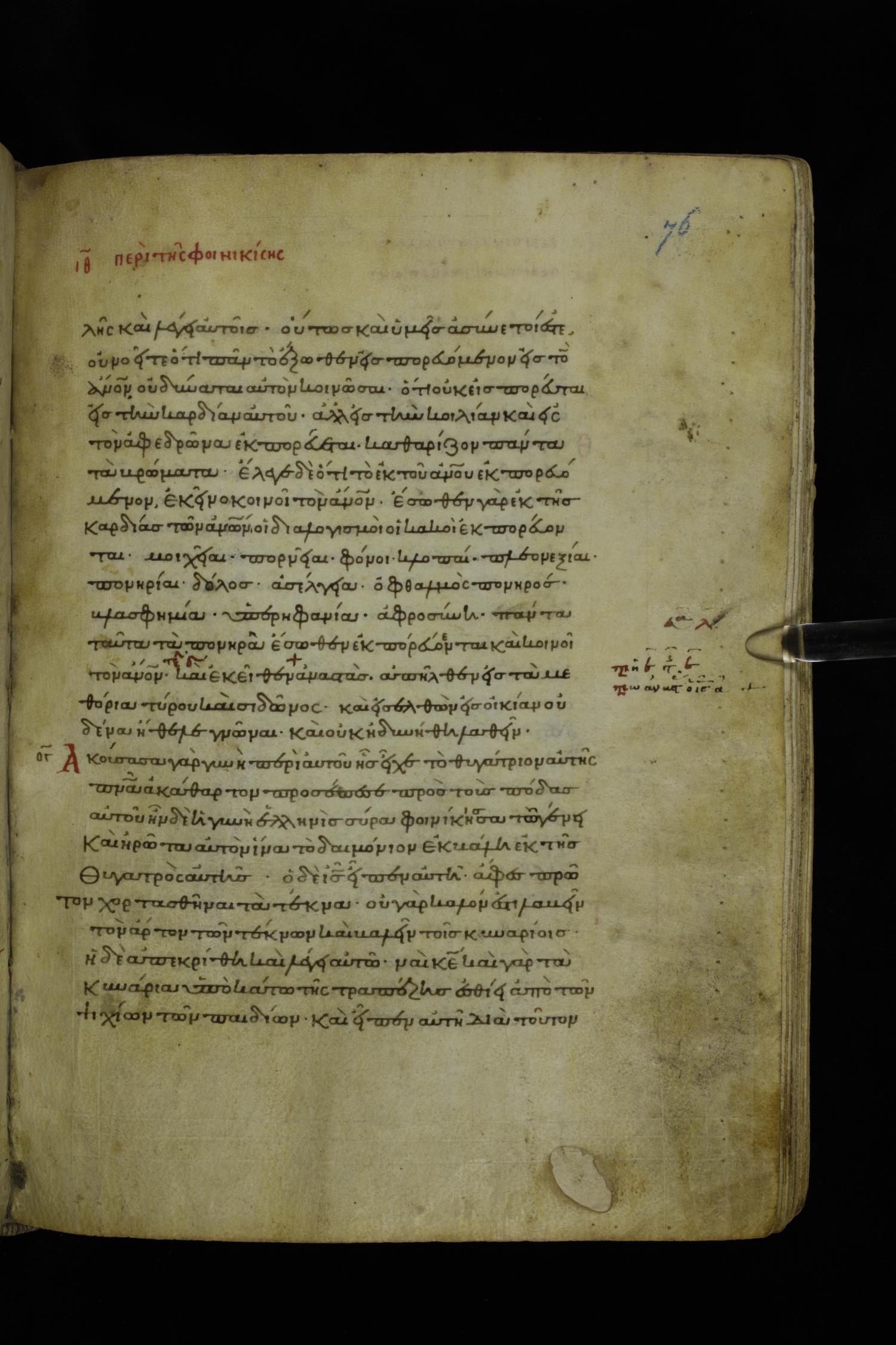 Twelfth century minuscule of the Gospels on parchment; 195 leaves, 1 column, 25 lines per column. Images were taken at the National Library of Greece in Athens.