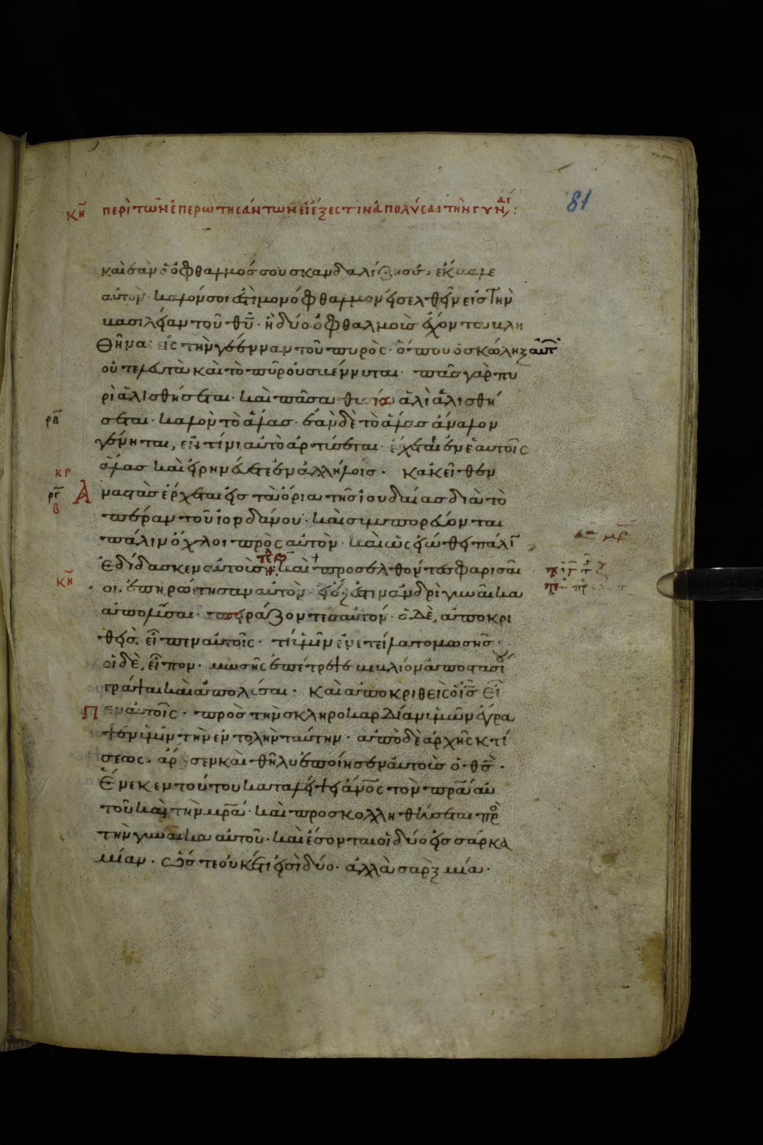 Twelfth century minuscule of the Gospels on parchment; 195 leaves, 1 column, 25 lines per column. Images were taken at the National Library of Greece in Athens.