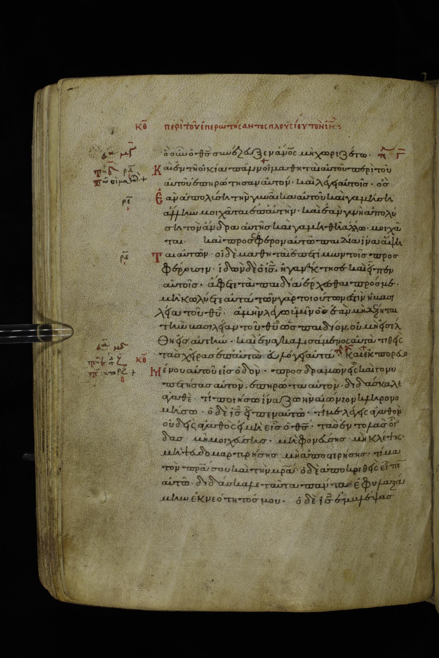Twelfth century minuscule of the Gospels on parchment; 195 leaves, 1 column, 25 lines per column. Images were taken at the National Library of Greece in Athens.