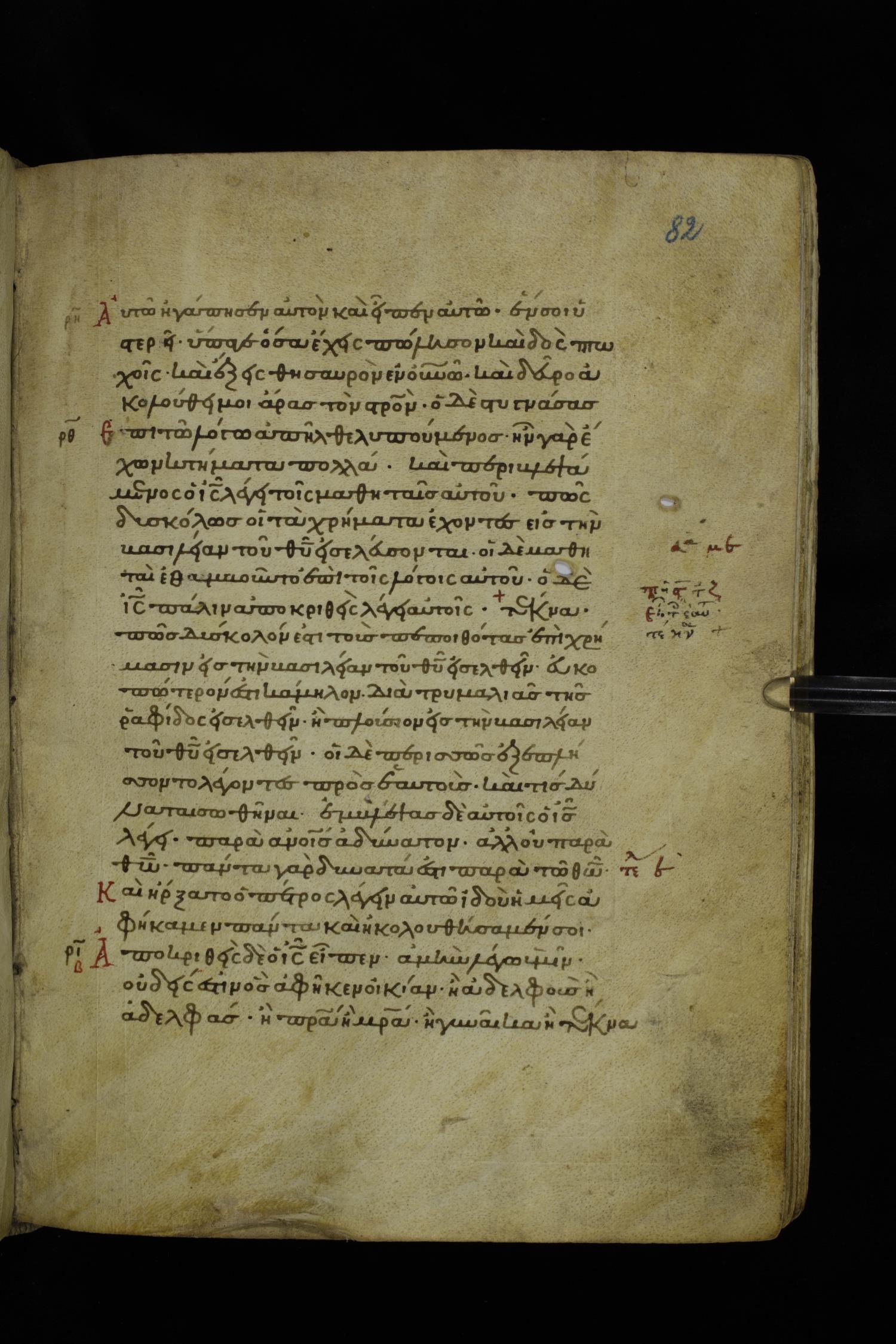 Twelfth century minuscule of the Gospels on parchment; 195 leaves, 1 column, 25 lines per column. Images were taken at the National Library of Greece in Athens.