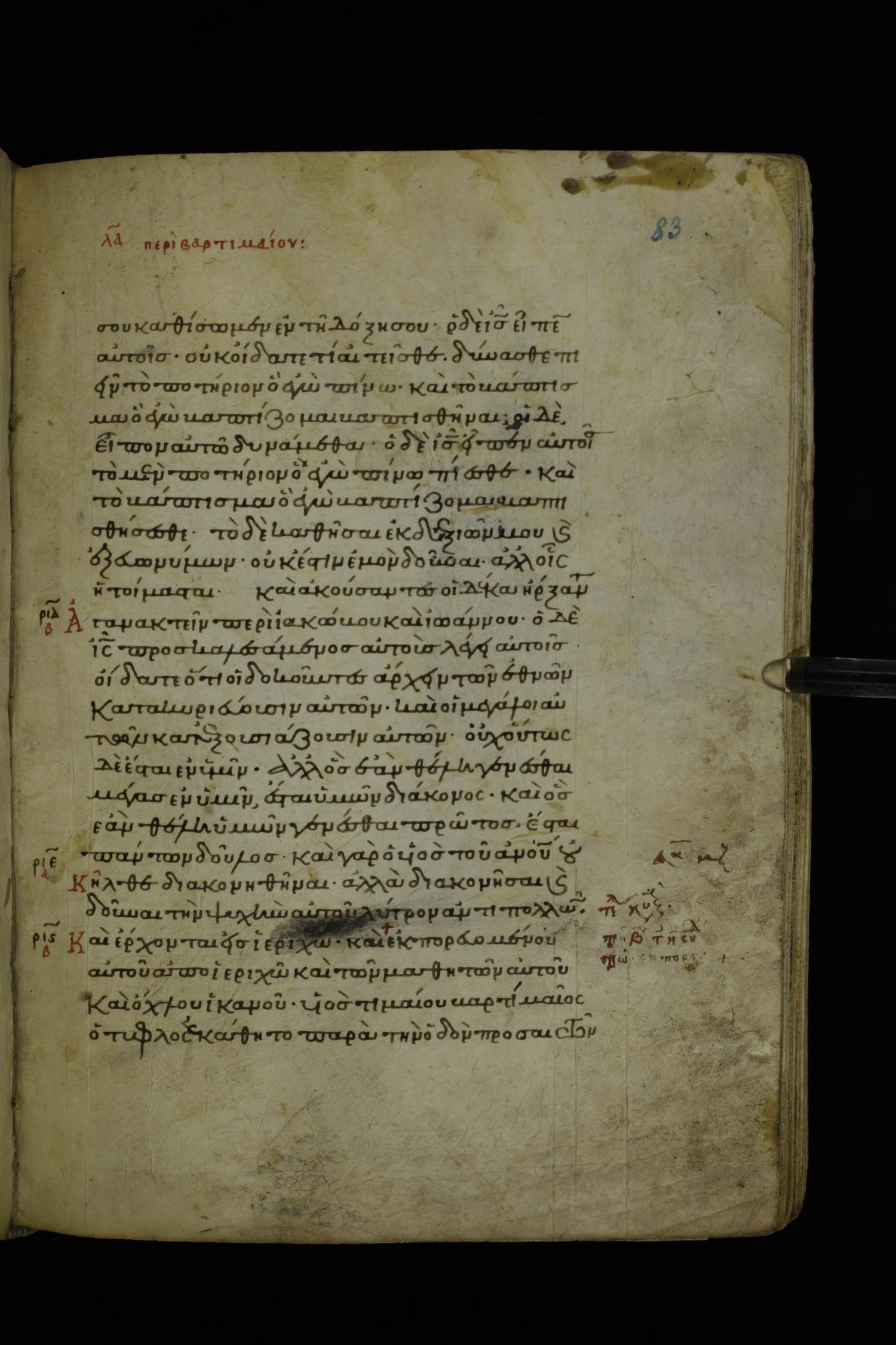 Twelfth century minuscule of the Gospels on parchment; 195 leaves, 1 column, 25 lines per column. Images were taken at the National Library of Greece in Athens.