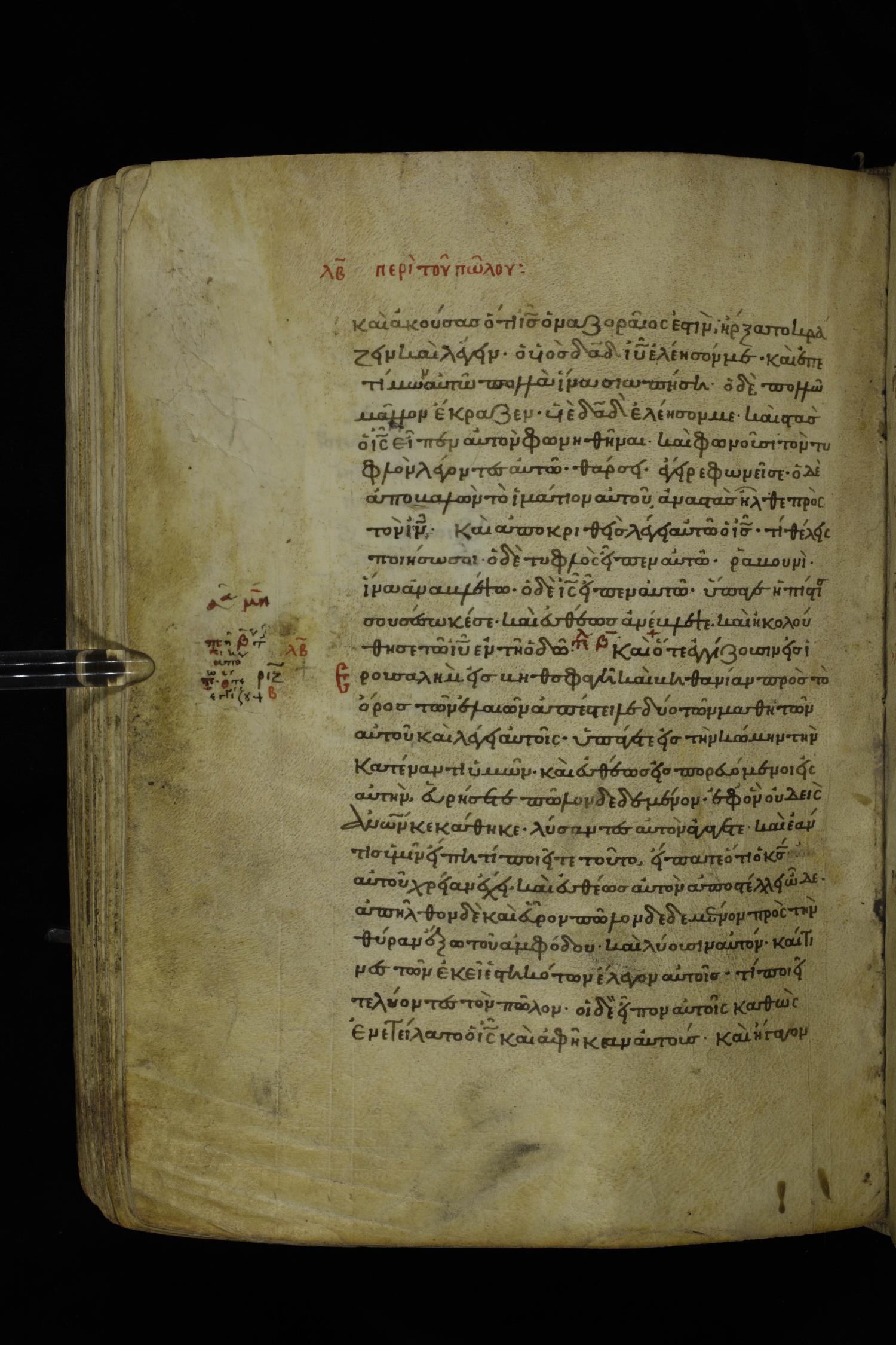 Twelfth century minuscule of the Gospels on parchment; 195 leaves, 1 column, 25 lines per column. Images were taken at the National Library of Greece in Athens.