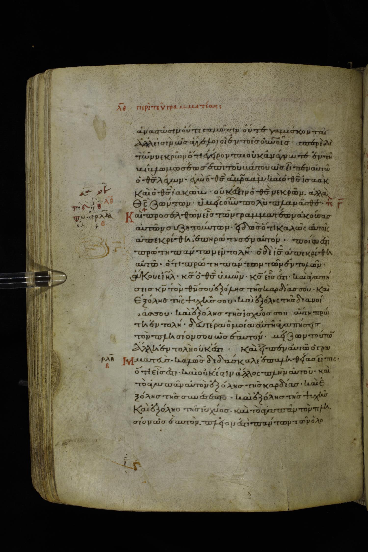 Twelfth century minuscule of the Gospels on parchment; 195 leaves, 1 column, 25 lines per column. Images were taken at the National Library of Greece in Athens.