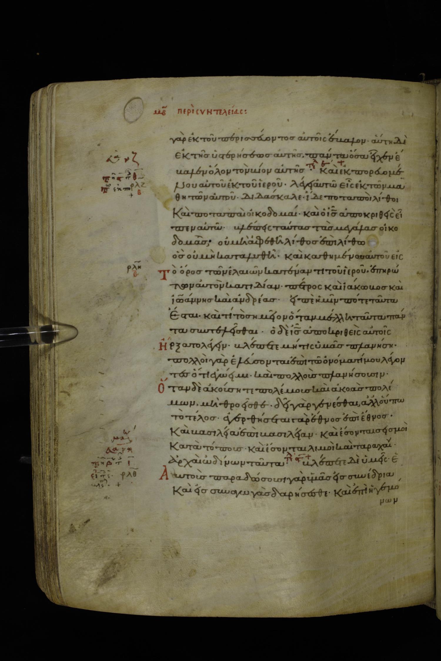 Twelfth century minuscule of the Gospels on parchment; 195 leaves, 1 column, 25 lines per column. Images were taken at the National Library of Greece in Athens.