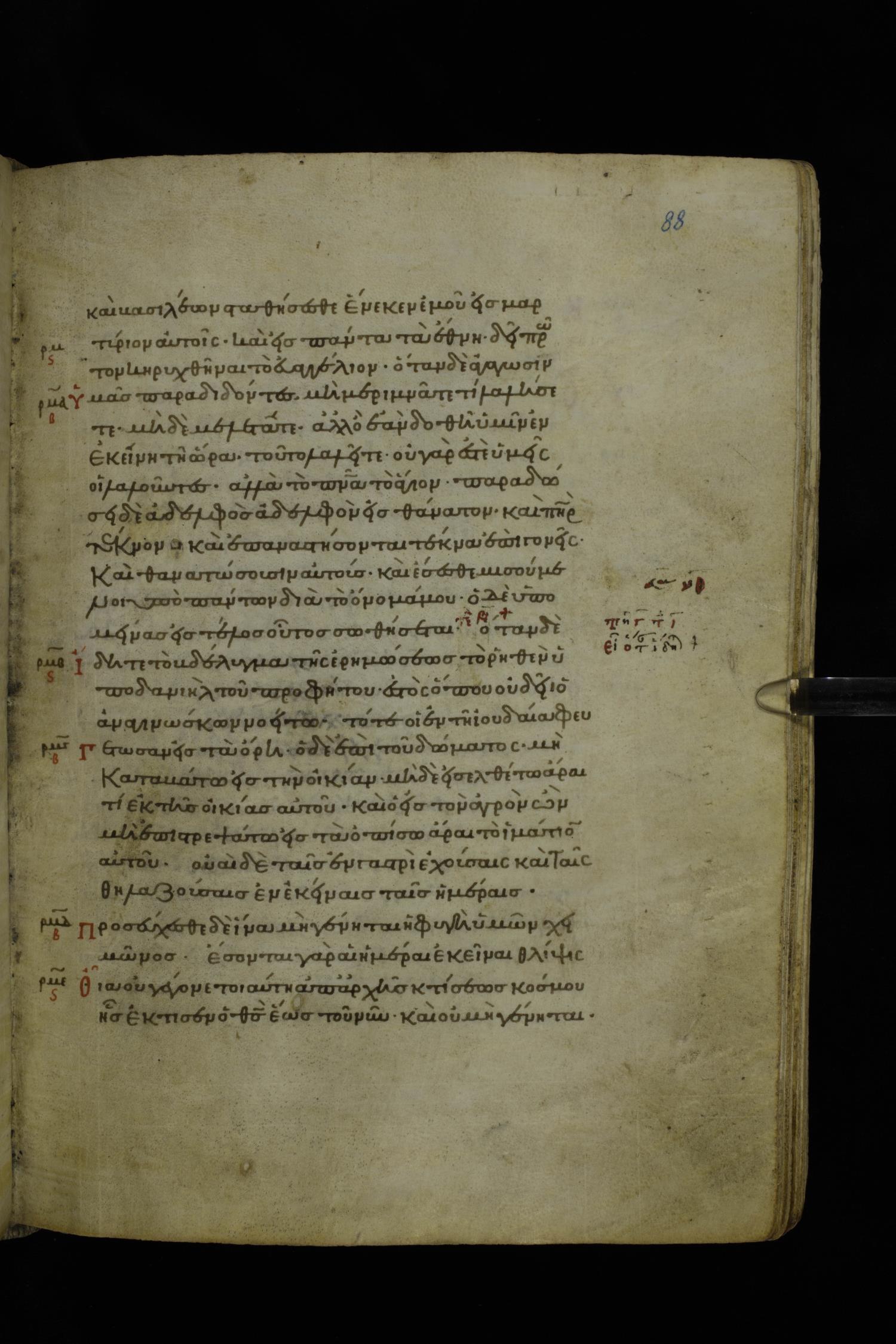 Twelfth century minuscule of the Gospels on parchment; 195 leaves, 1 column, 25 lines per column. Images were taken at the National Library of Greece in Athens.