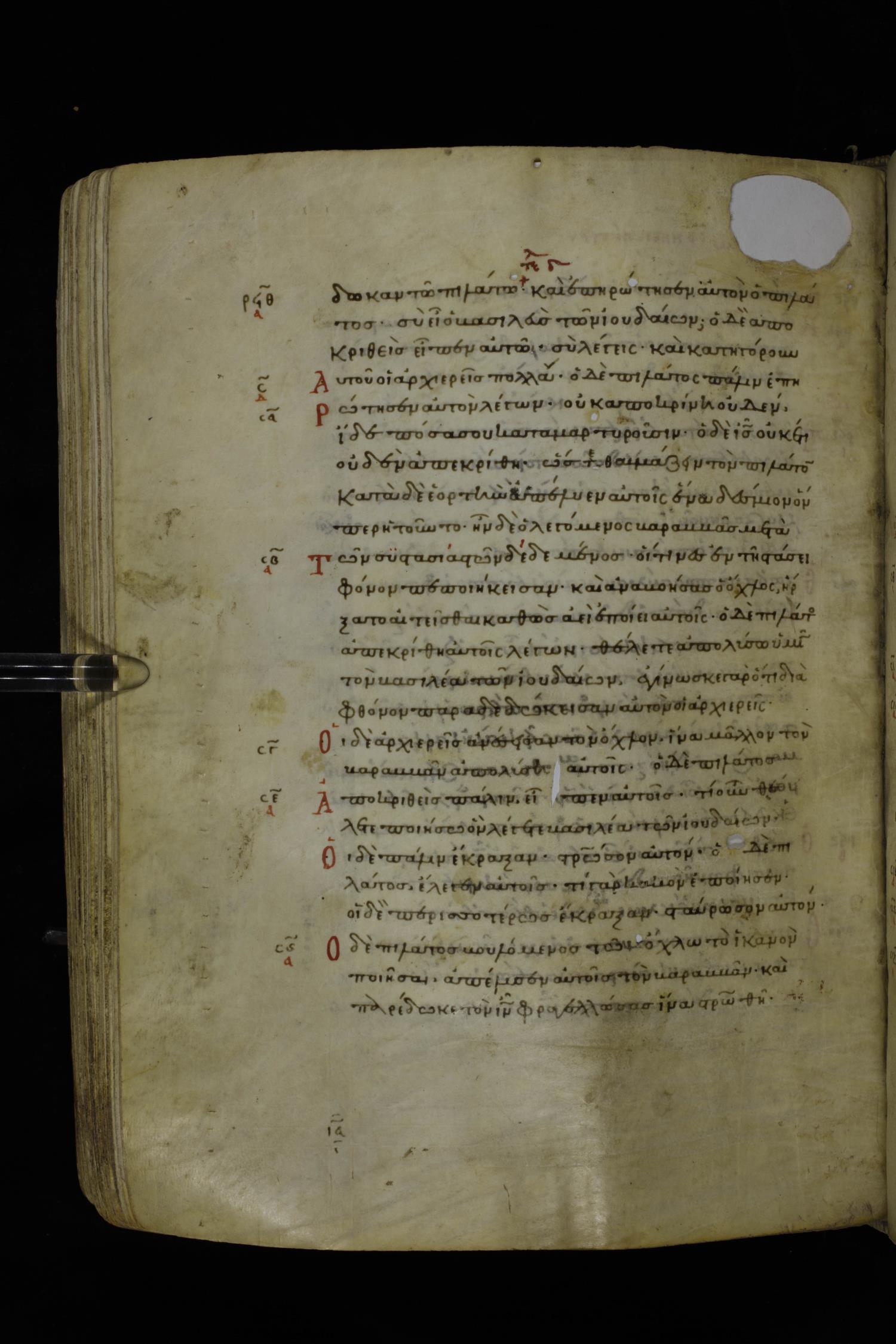 Twelfth century minuscule of the Gospels on parchment; 195 leaves, 1 column, 25 lines per column. Images were taken at the National Library of Greece in Athens.