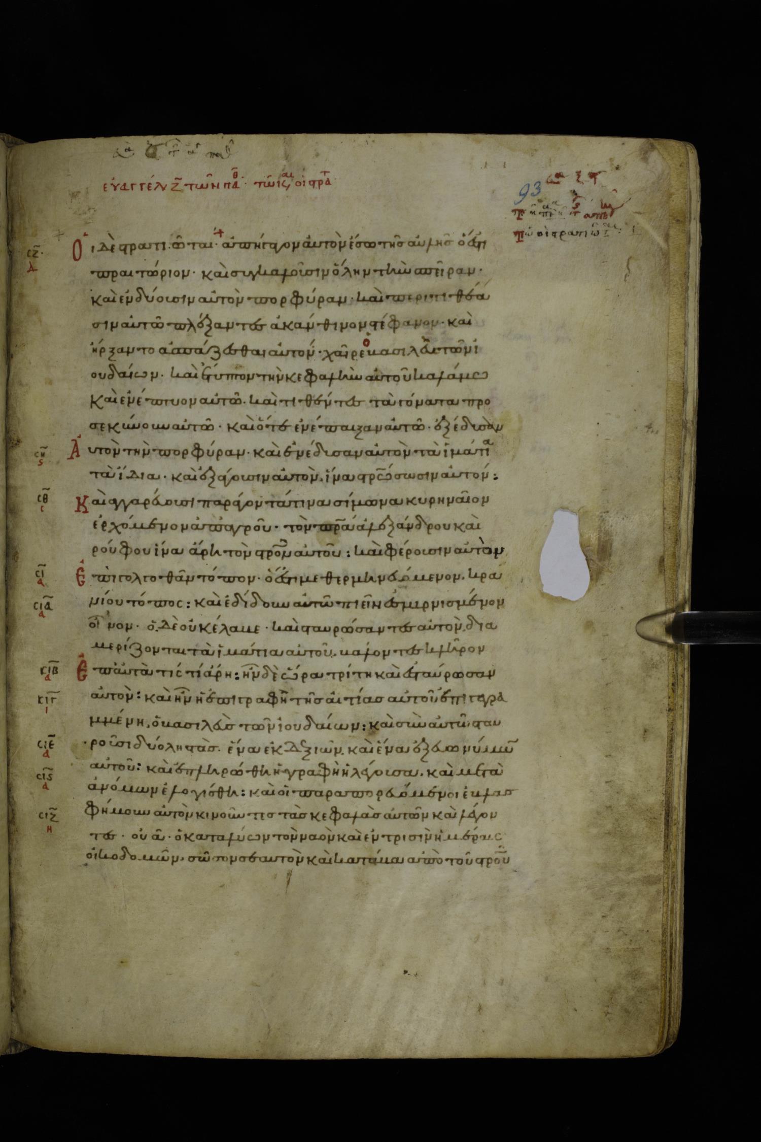 Twelfth century minuscule of the Gospels on parchment; 195 leaves, 1 column, 25 lines per column. Images were taken at the National Library of Greece in Athens.