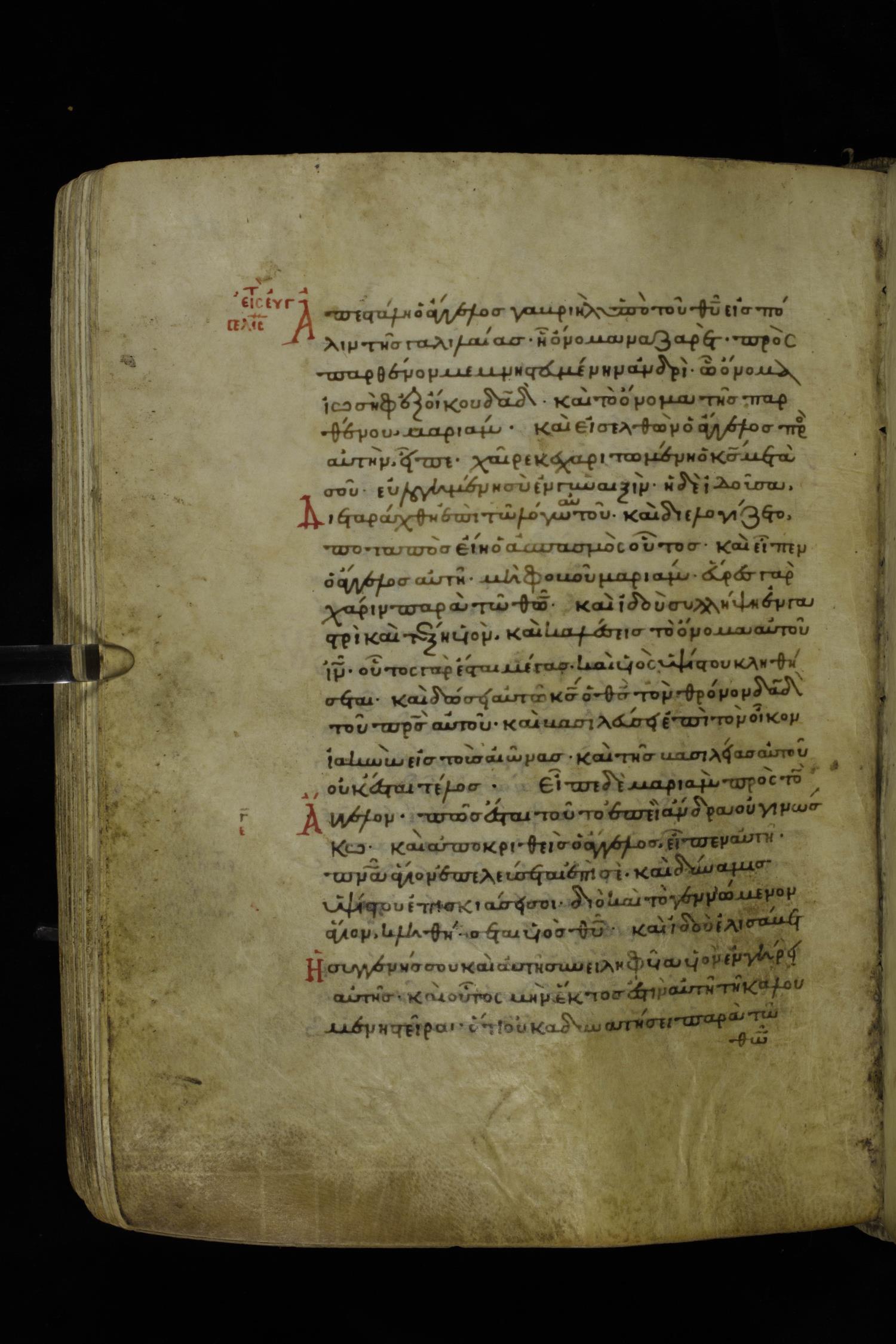 Twelfth century minuscule of the Gospels on parchment; 195 leaves, 1 column, 25 lines per column. Images were taken at the National Library of Greece in Athens.