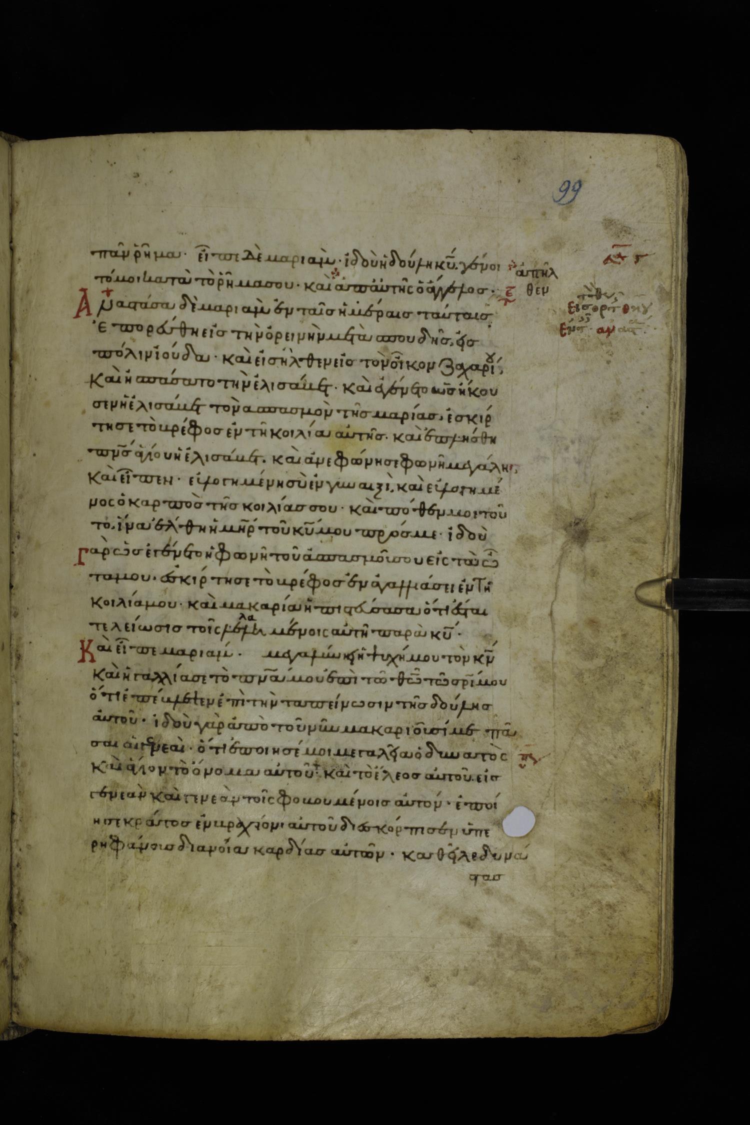 Twelfth century minuscule of the Gospels on parchment; 195 leaves, 1 column, 25 lines per column. Images were taken at the National Library of Greece in Athens.