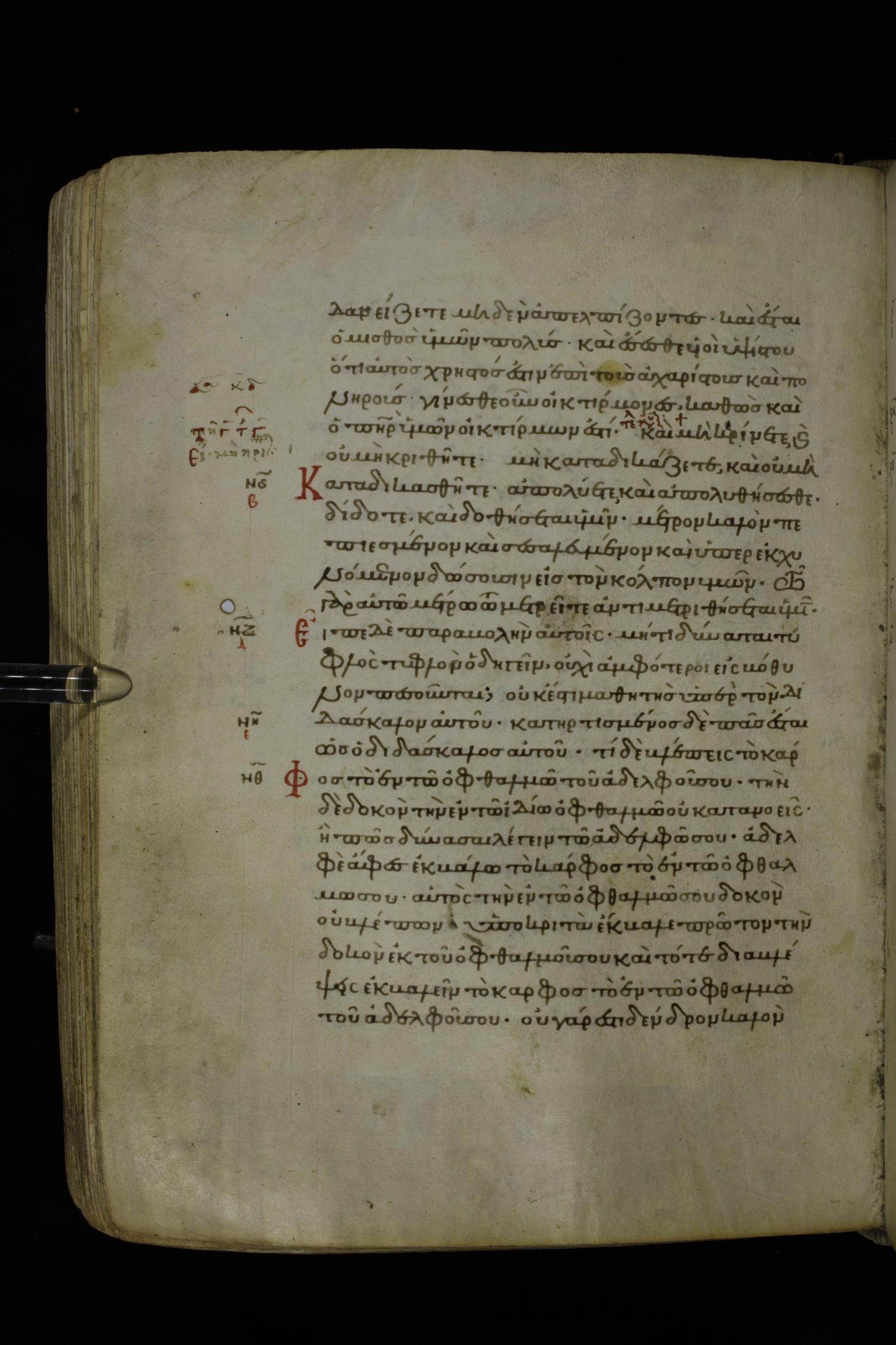 Twelfth century minuscule of the Gospels on parchment; 195 leaves, 1 column, 25 lines per column. Images were taken at the National Library of Greece in Athens.