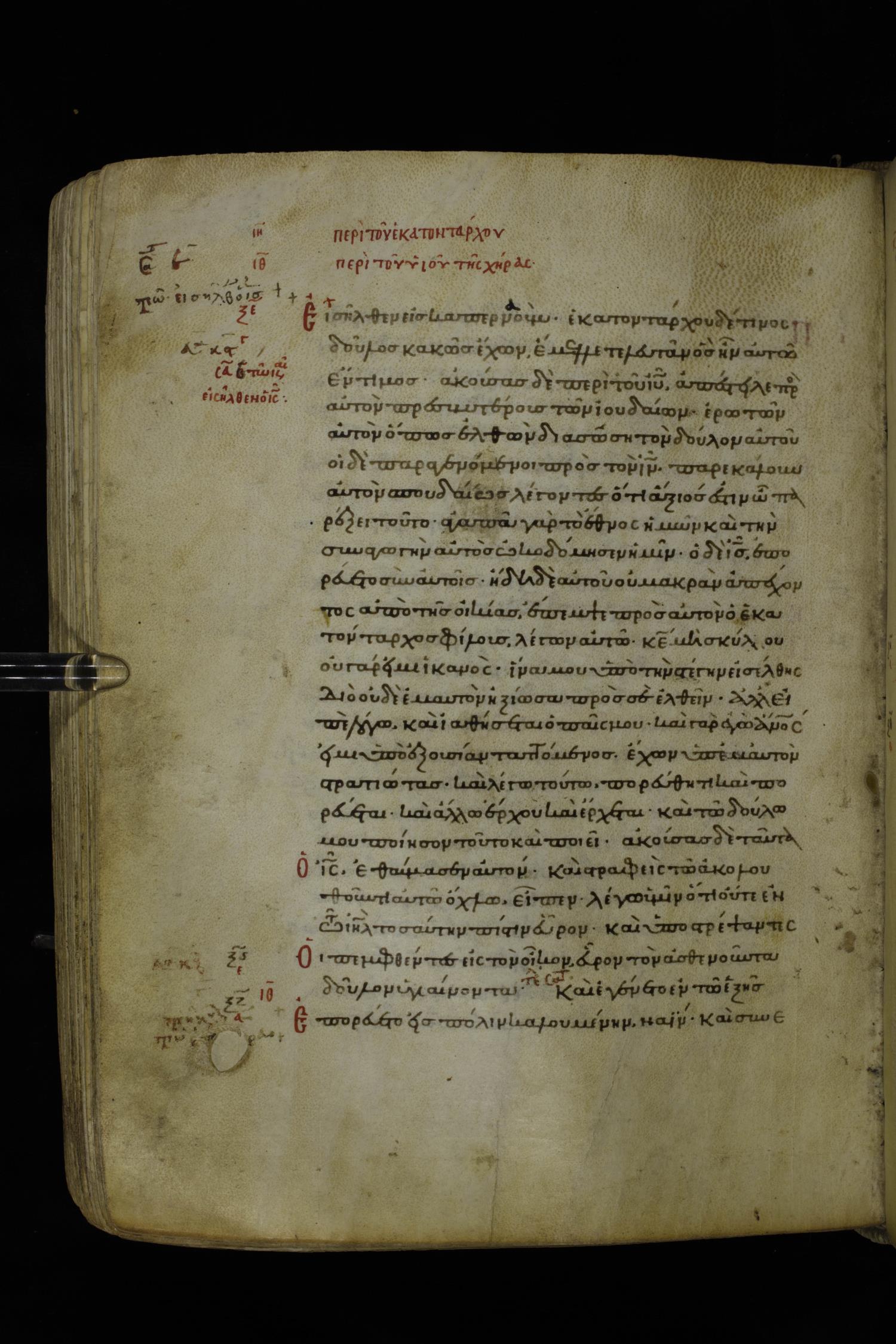 Twelfth century minuscule of the Gospels on parchment; 195 leaves, 1 column, 25 lines per column. Images were taken at the National Library of Greece in Athens.