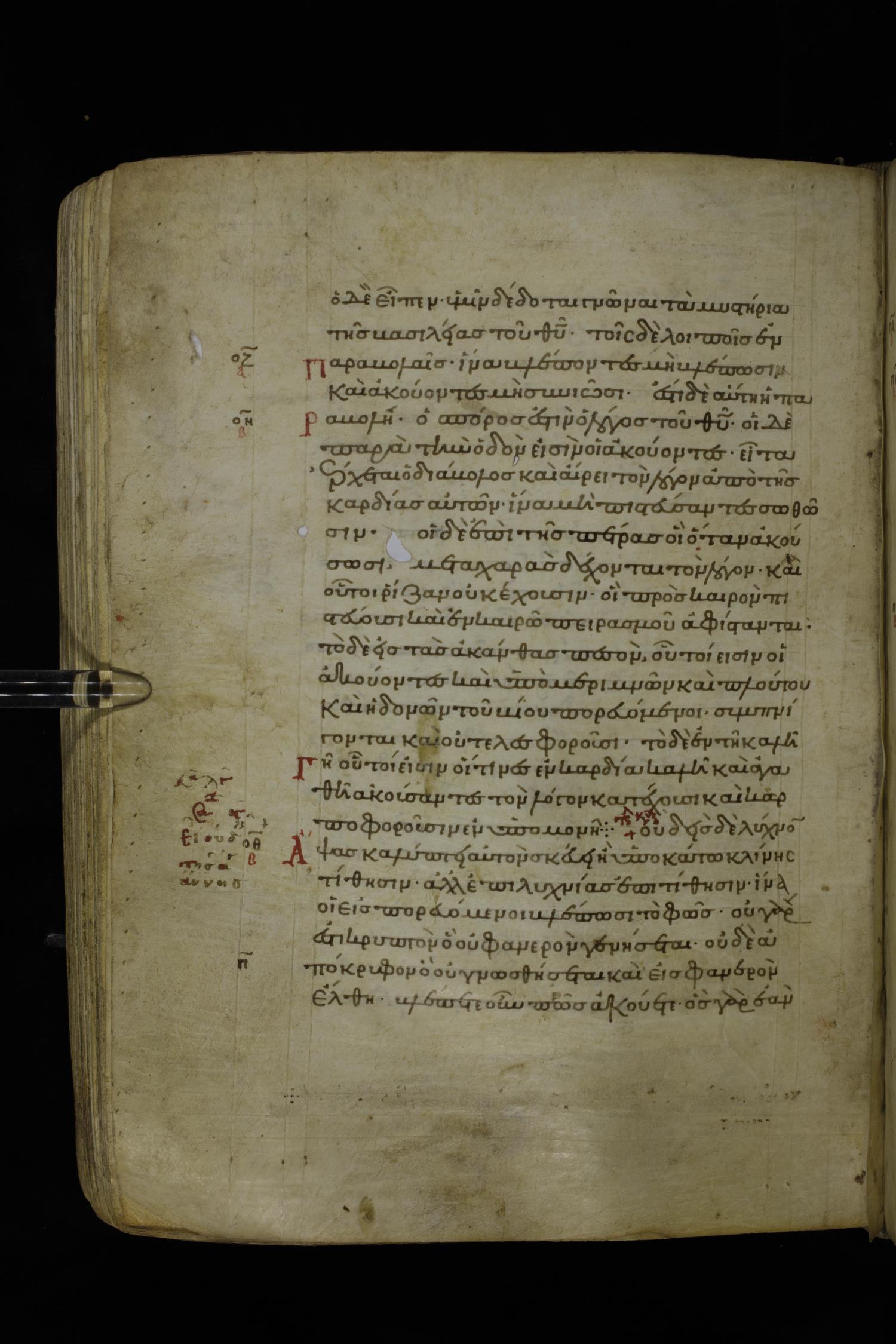 Twelfth century minuscule of the Gospels on parchment; 195 leaves, 1 column, 25 lines per column. Images were taken at the National Library of Greece in Athens.