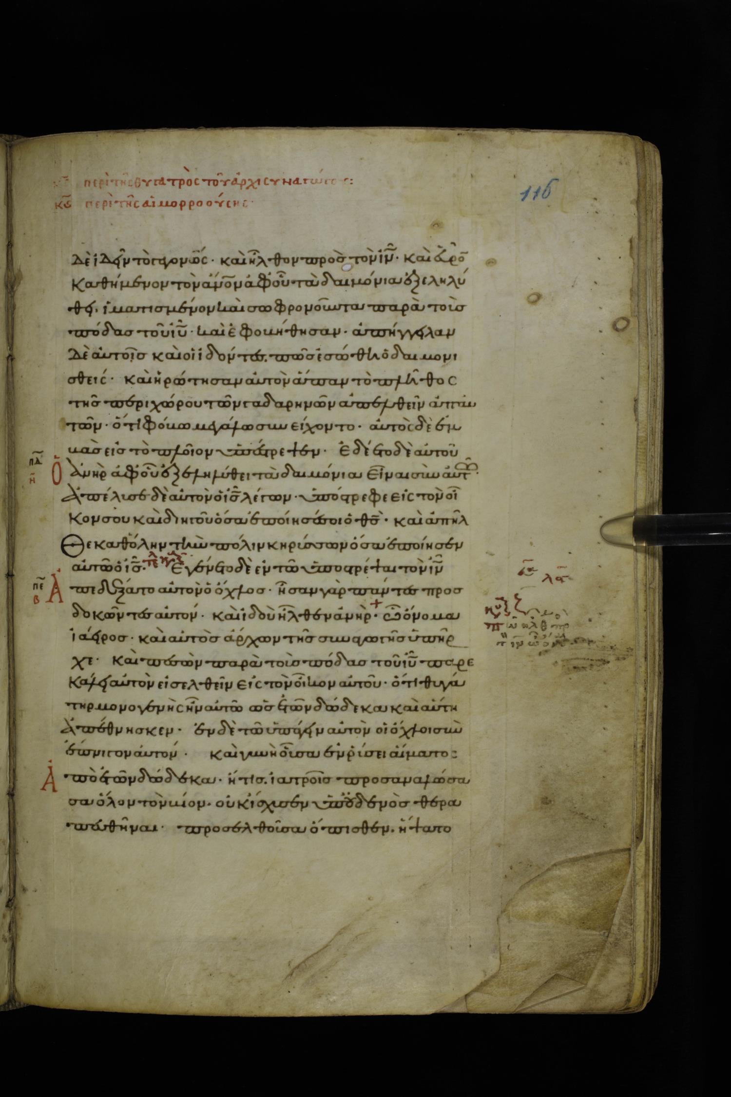 Twelfth century minuscule of the Gospels on parchment; 195 leaves, 1 column, 25 lines per column. Images were taken at the National Library of Greece in Athens.
