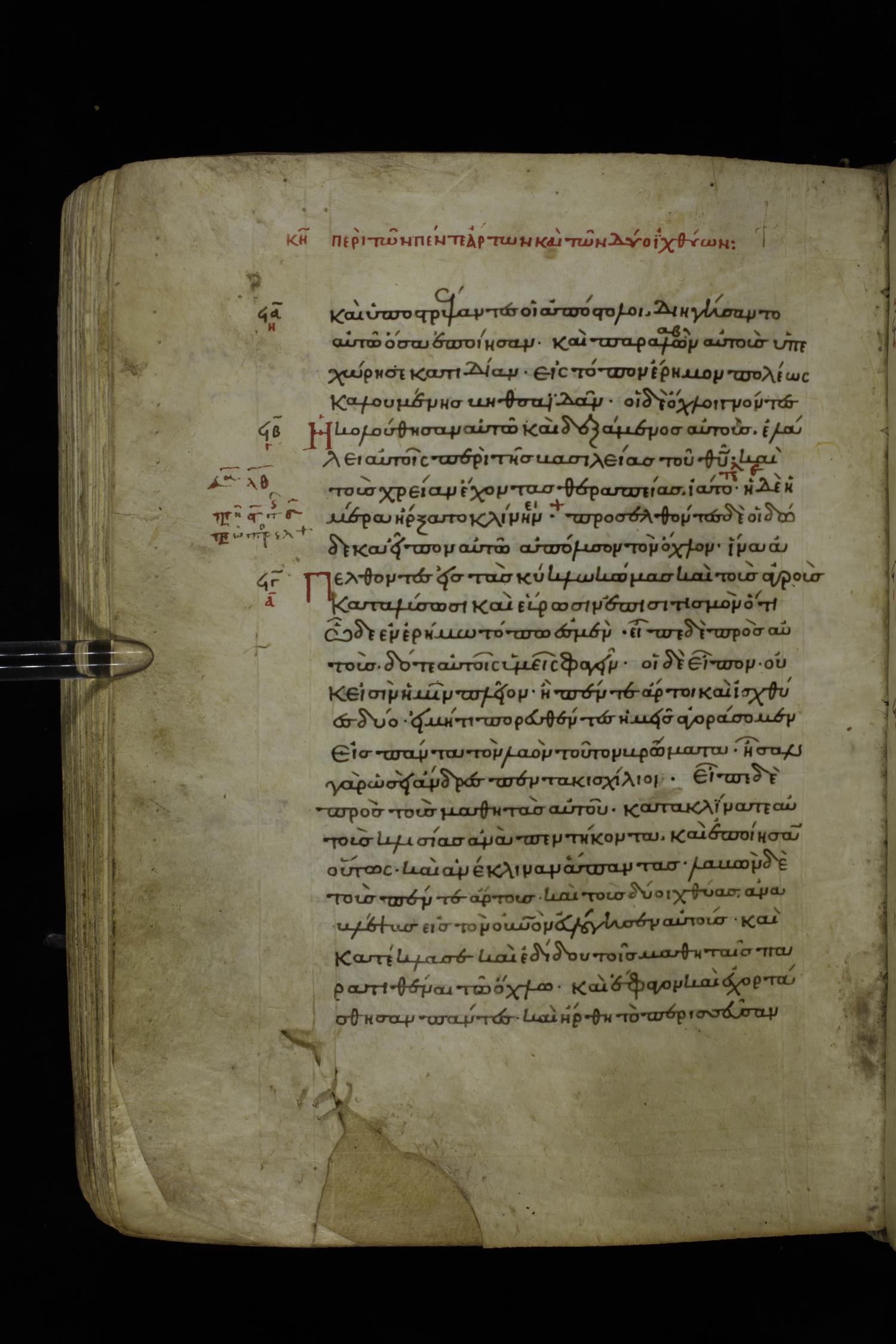 Twelfth century minuscule of the Gospels on parchment; 195 leaves, 1 column, 25 lines per column. Images were taken at the National Library of Greece in Athens.