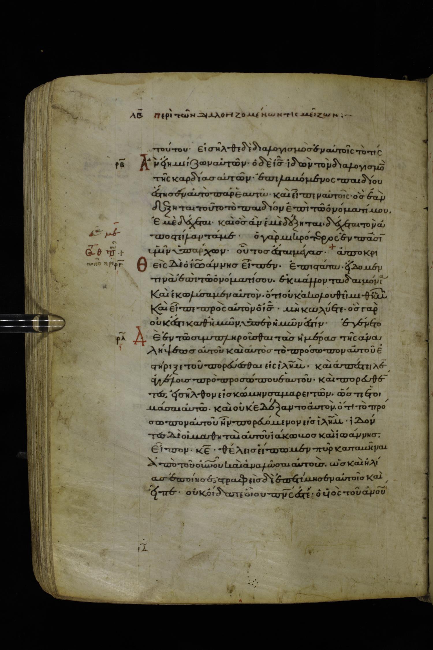Twelfth century minuscule of the Gospels on parchment; 195 leaves, 1 column, 25 lines per column. Images were taken at the National Library of Greece in Athens.