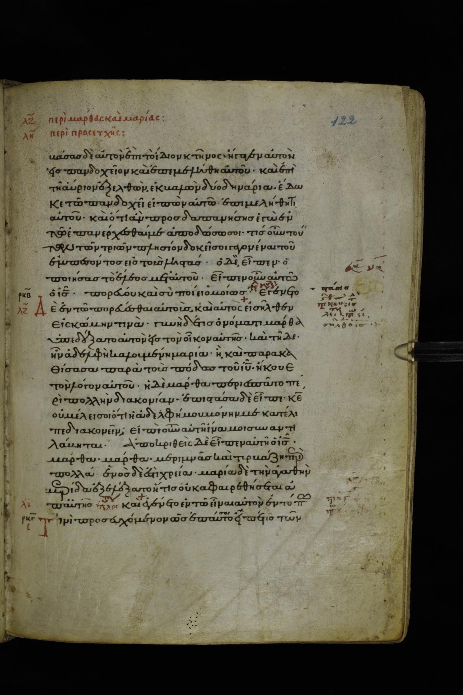Twelfth century minuscule of the Gospels on parchment; 195 leaves, 1 column, 25 lines per column. Images were taken at the National Library of Greece in Athens.