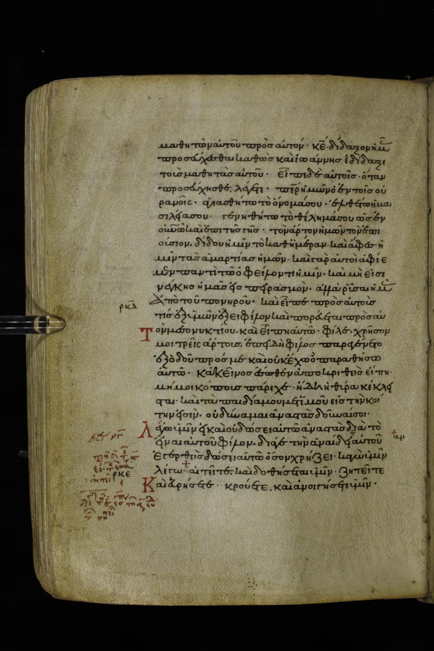 Twelfth century minuscule of the Gospels on parchment; 195 leaves, 1 column, 25 lines per column. Images were taken at the National Library of Greece in Athens.