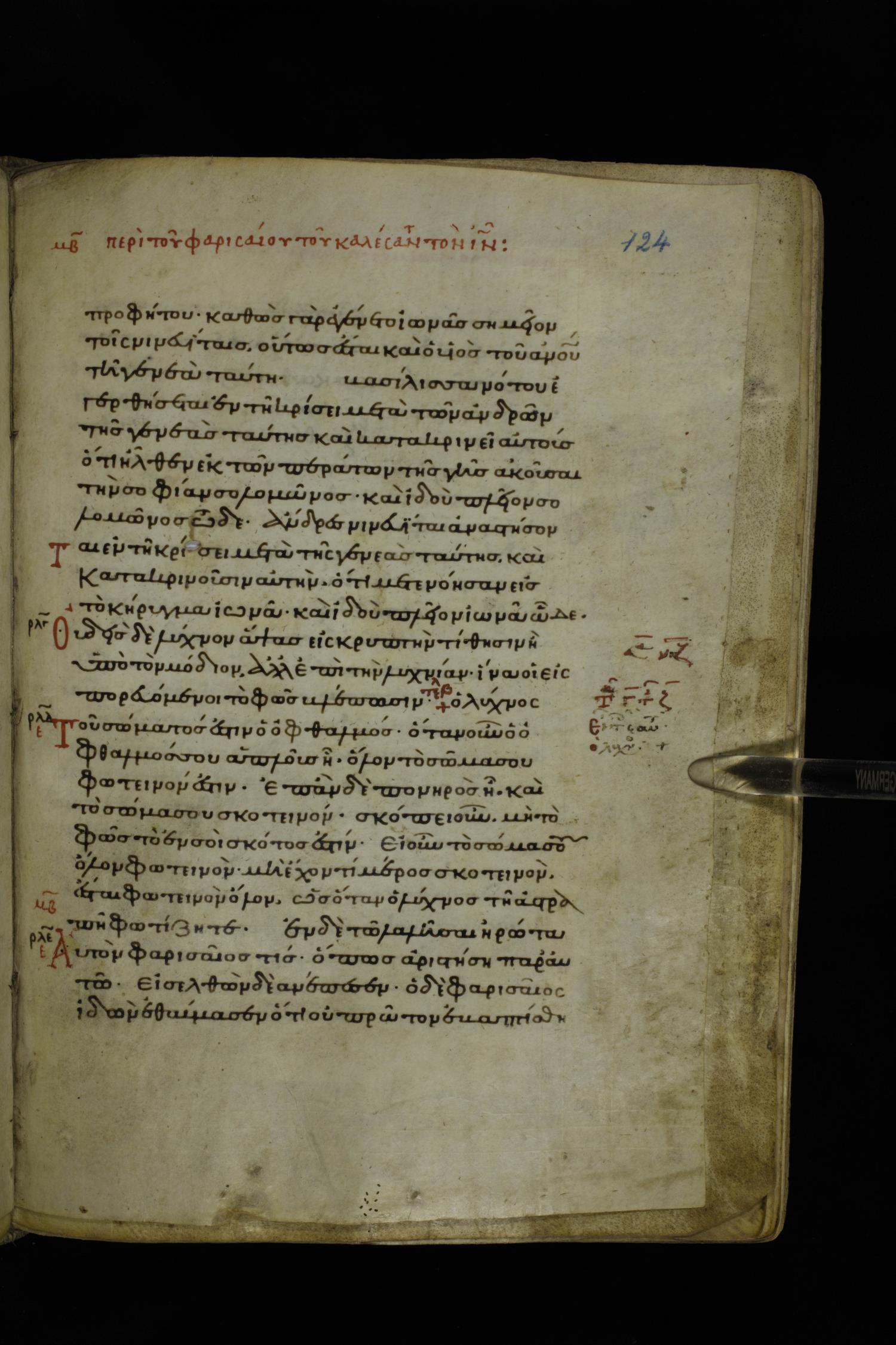 Twelfth century minuscule of the Gospels on parchment; 195 leaves, 1 column, 25 lines per column. Images were taken at the National Library of Greece in Athens.