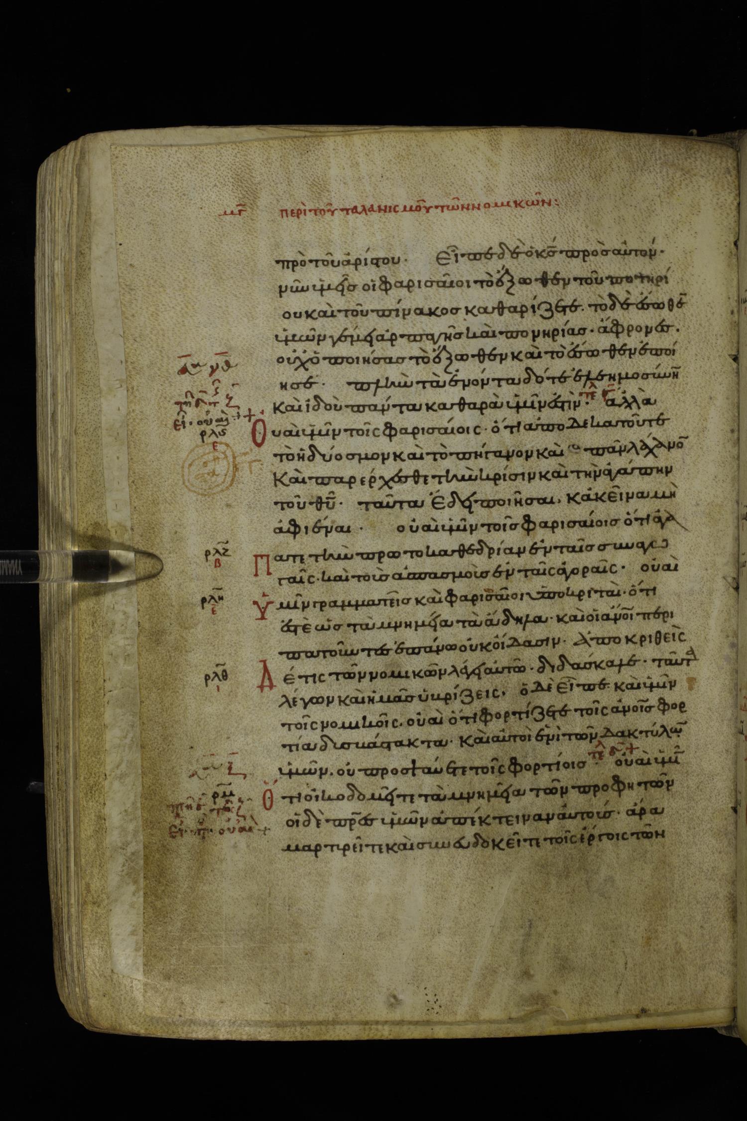 Twelfth century minuscule of the Gospels on parchment; 195 leaves, 1 column, 25 lines per column. Images were taken at the National Library of Greece in Athens.