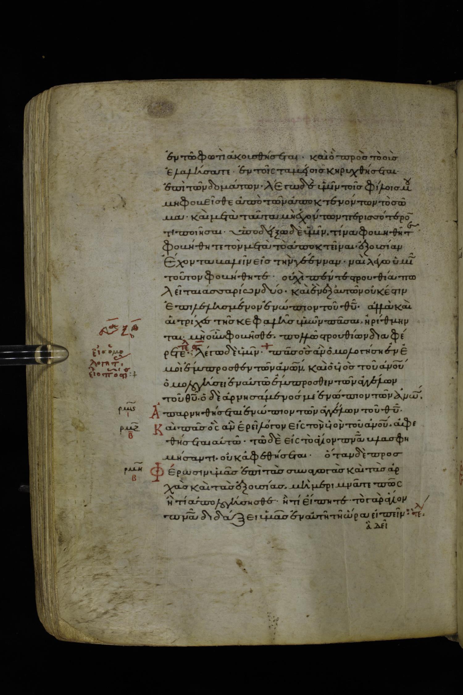 Twelfth century minuscule of the Gospels on parchment; 195 leaves, 1 column, 25 lines per column. Images were taken at the National Library of Greece in Athens.