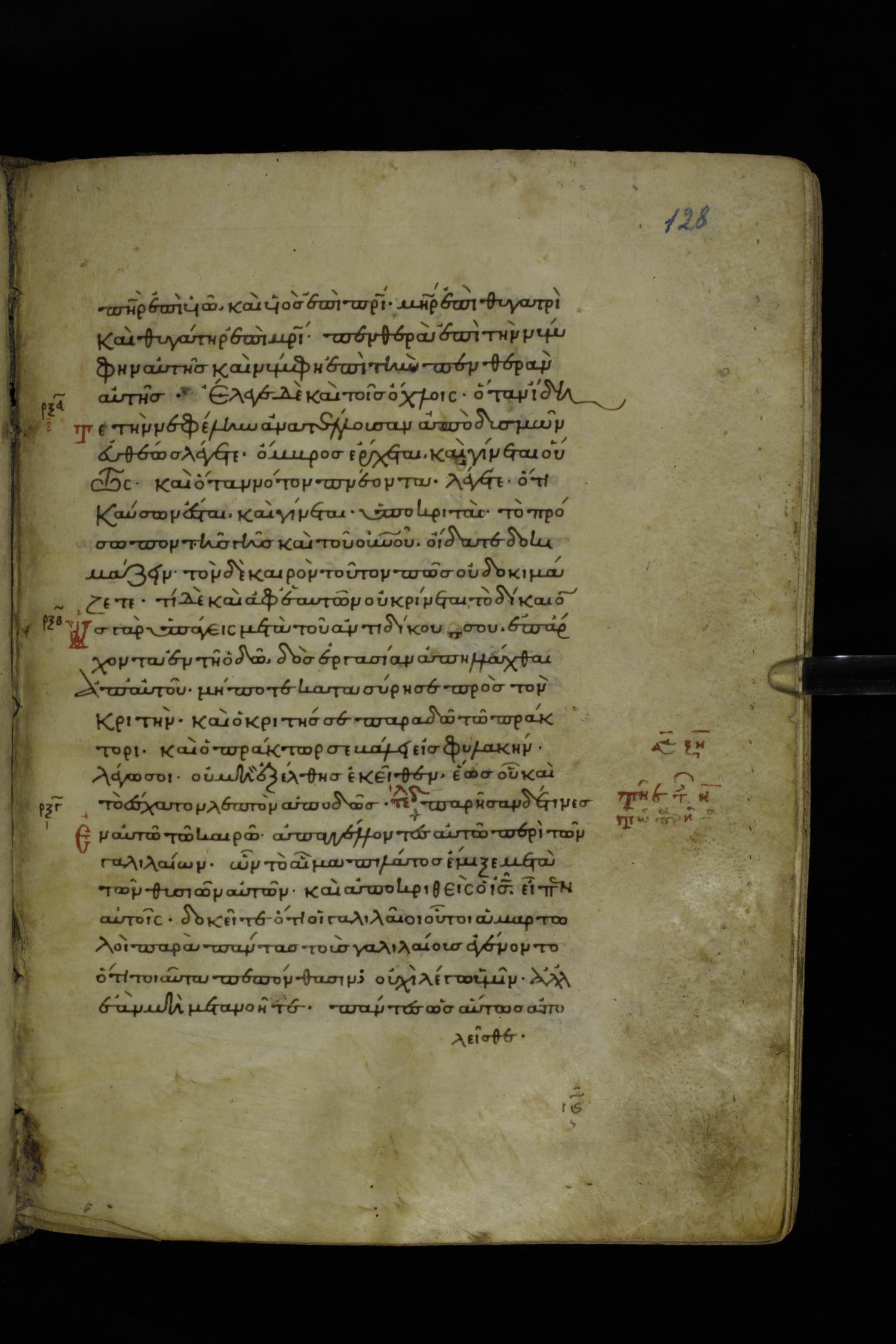 Twelfth century minuscule of the Gospels on parchment; 195 leaves, 1 column, 25 lines per column. Images were taken at the National Library of Greece in Athens.