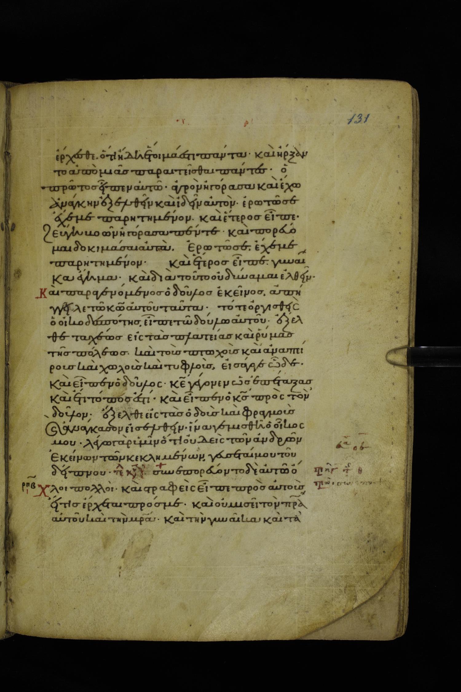 Twelfth century minuscule of the Gospels on parchment; 195 leaves, 1 column, 25 lines per column. Images were taken at the National Library of Greece in Athens.