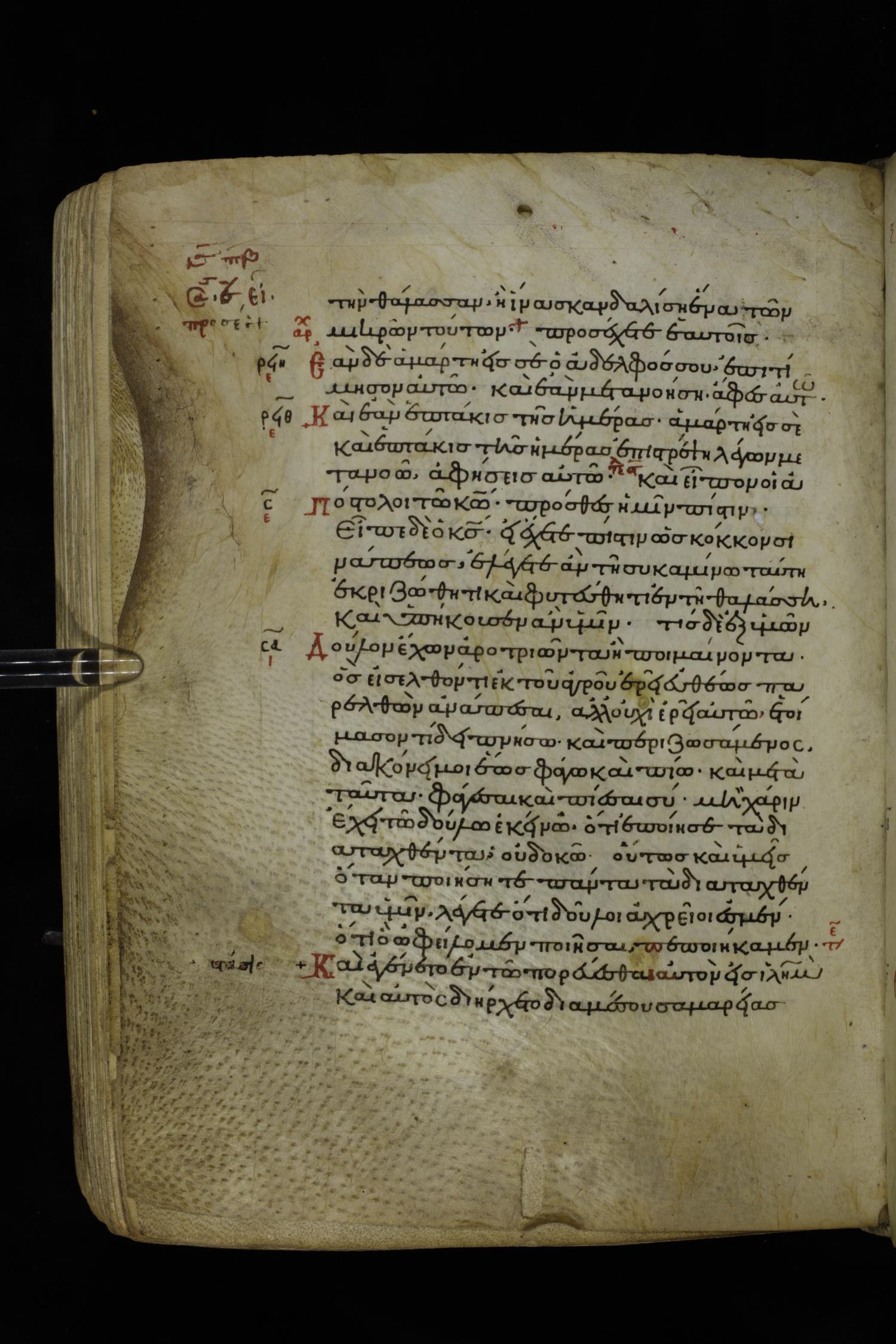 Twelfth century minuscule of the Gospels on parchment; 195 leaves, 1 column, 25 lines per column. Images were taken at the National Library of Greece in Athens.