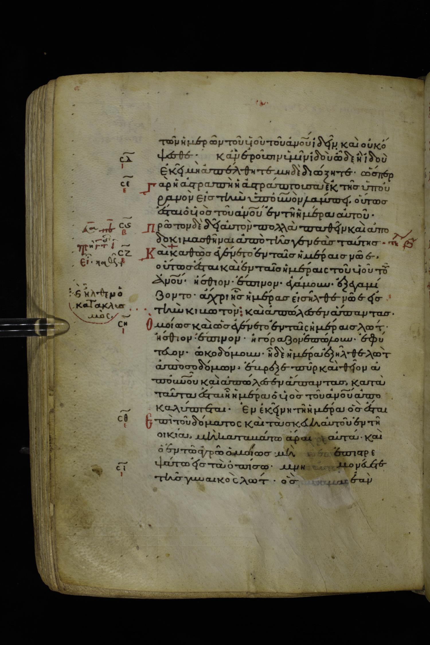 Twelfth century minuscule of the Gospels on parchment; 195 leaves, 1 column, 25 lines per column. Images were taken at the National Library of Greece in Athens.
