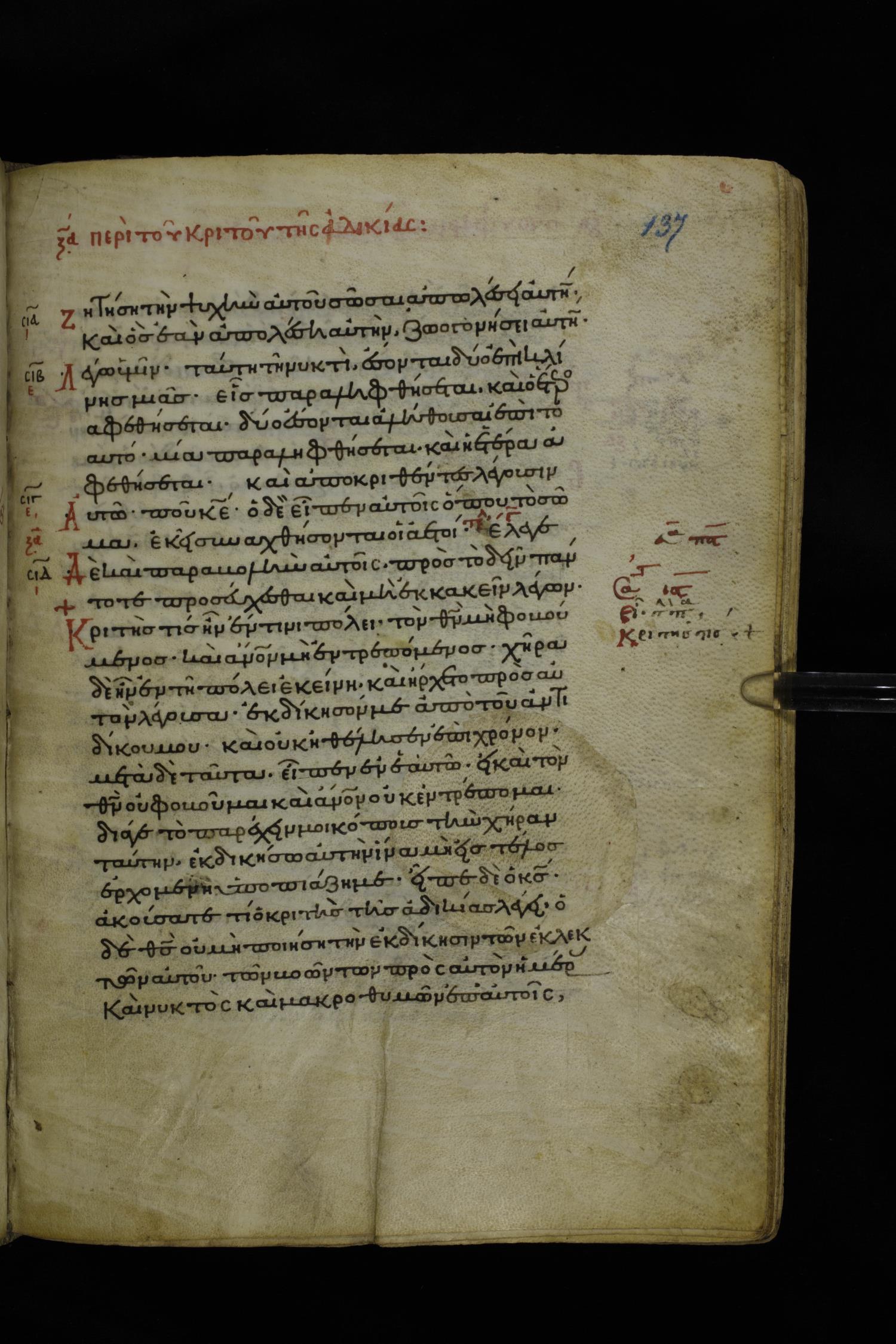 Twelfth century minuscule of the Gospels on parchment; 195 leaves, 1 column, 25 lines per column. Images were taken at the National Library of Greece in Athens.