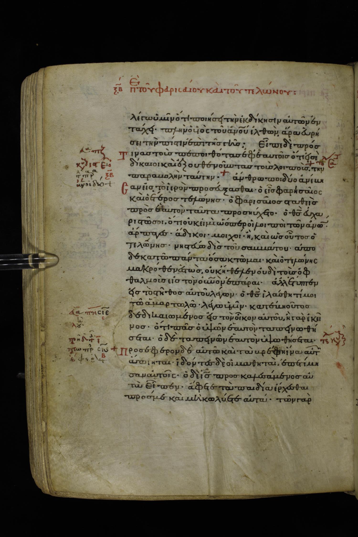 Twelfth century minuscule of the Gospels on parchment; 195 leaves, 1 column, 25 lines per column. Images were taken at the National Library of Greece in Athens.
