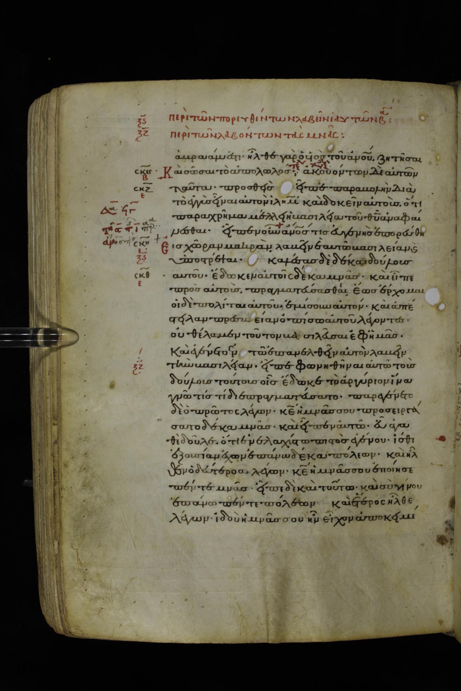 Twelfth century minuscule of the Gospels on parchment; 195 leaves, 1 column, 25 lines per column. Images were taken at the National Library of Greece in Athens.