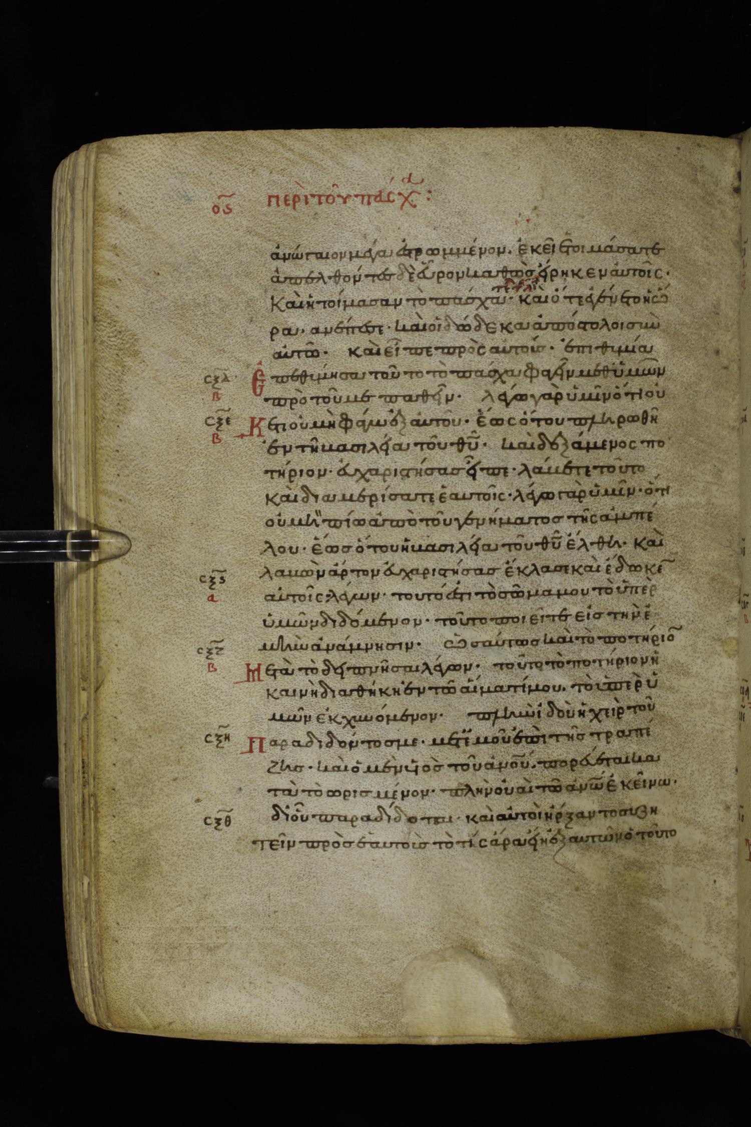 Twelfth century minuscule of the Gospels on parchment; 195 leaves, 1 column, 25 lines per column. Images were taken at the National Library of Greece in Athens.
