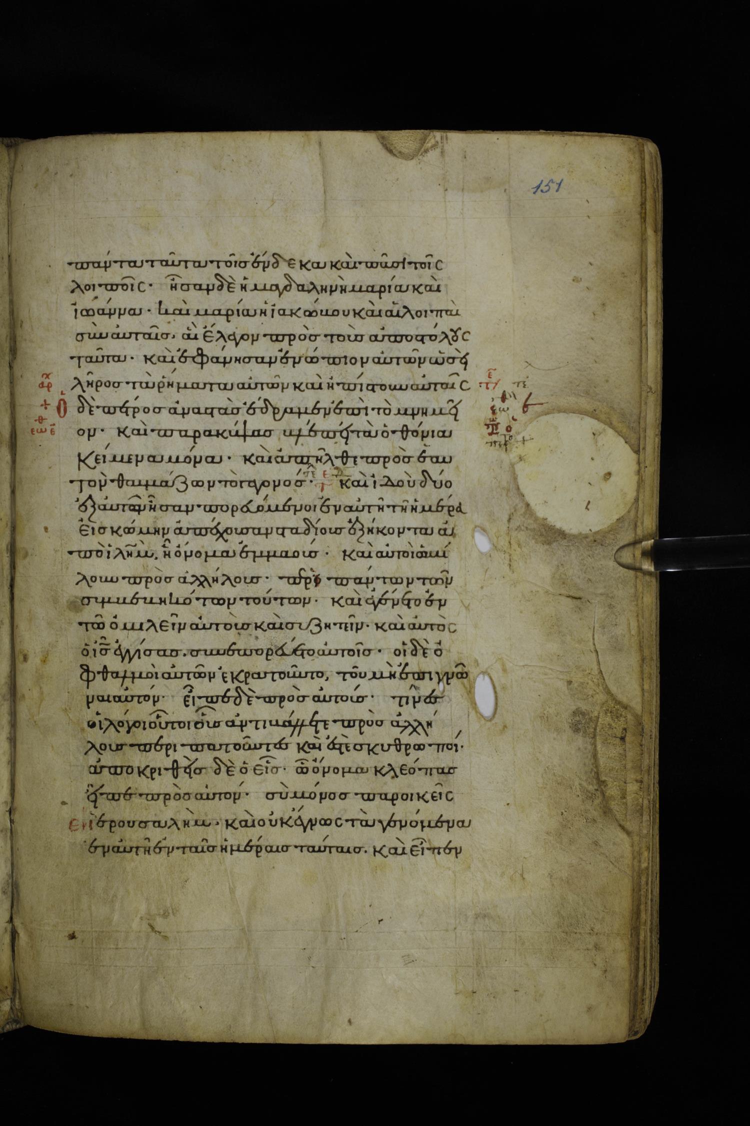 Twelfth century minuscule of the Gospels on parchment; 195 leaves, 1 column, 25 lines per column. Images were taken at the National Library of Greece in Athens.