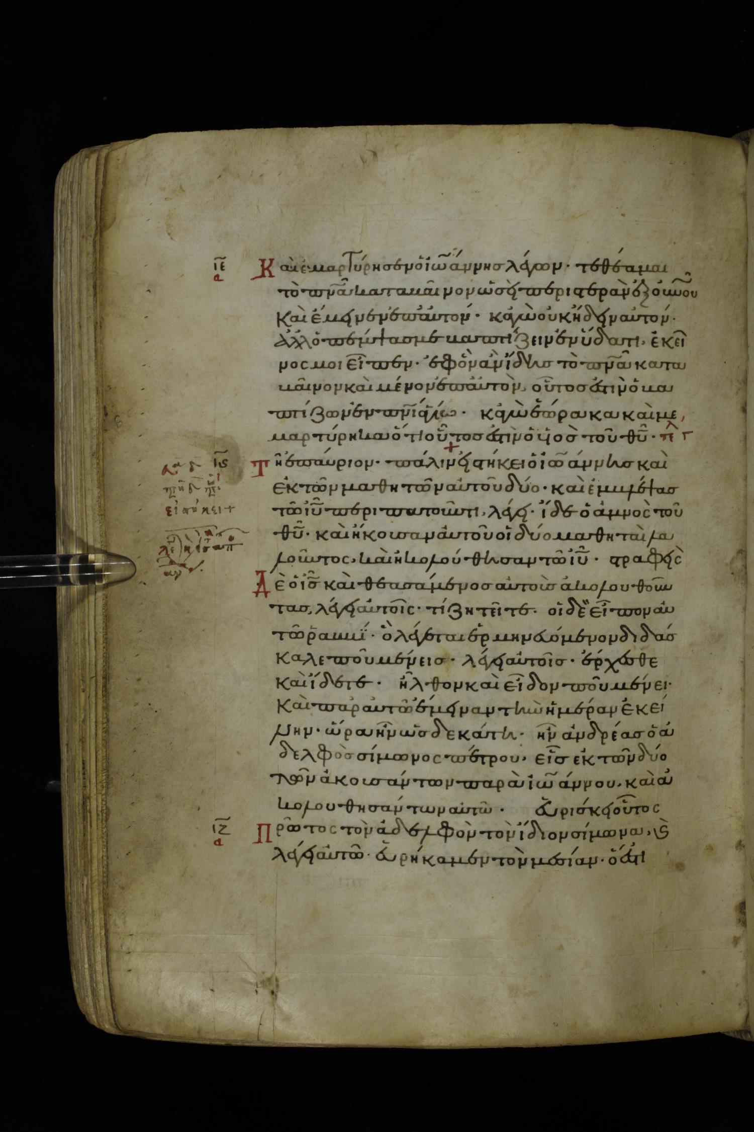 Twelfth century minuscule of the Gospels on parchment; 195 leaves, 1 column, 25 lines per column. Images were taken at the National Library of Greece in Athens.