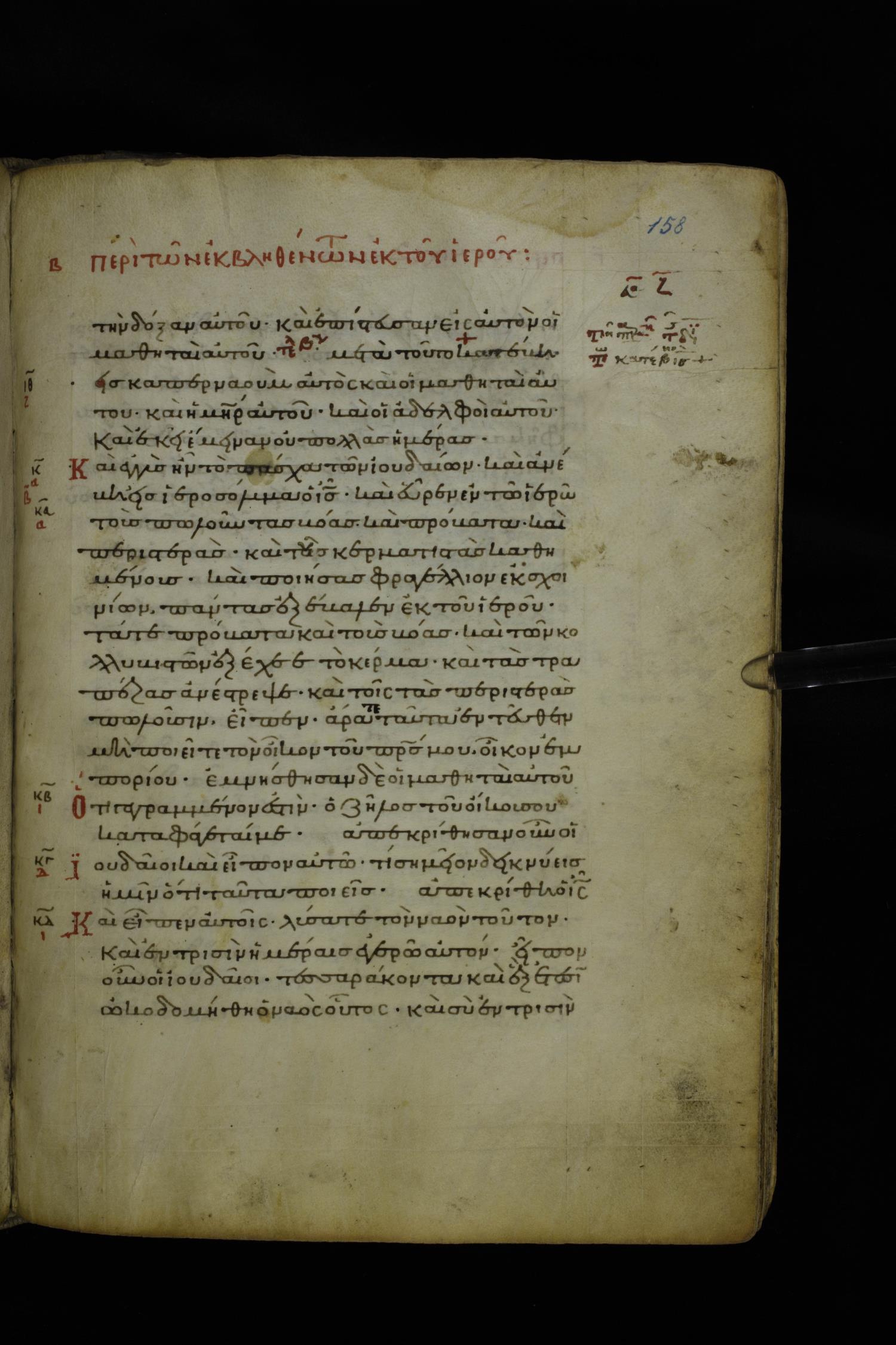 Twelfth century minuscule of the Gospels on parchment; 195 leaves, 1 column, 25 lines per column. Images were taken at the National Library of Greece in Athens.