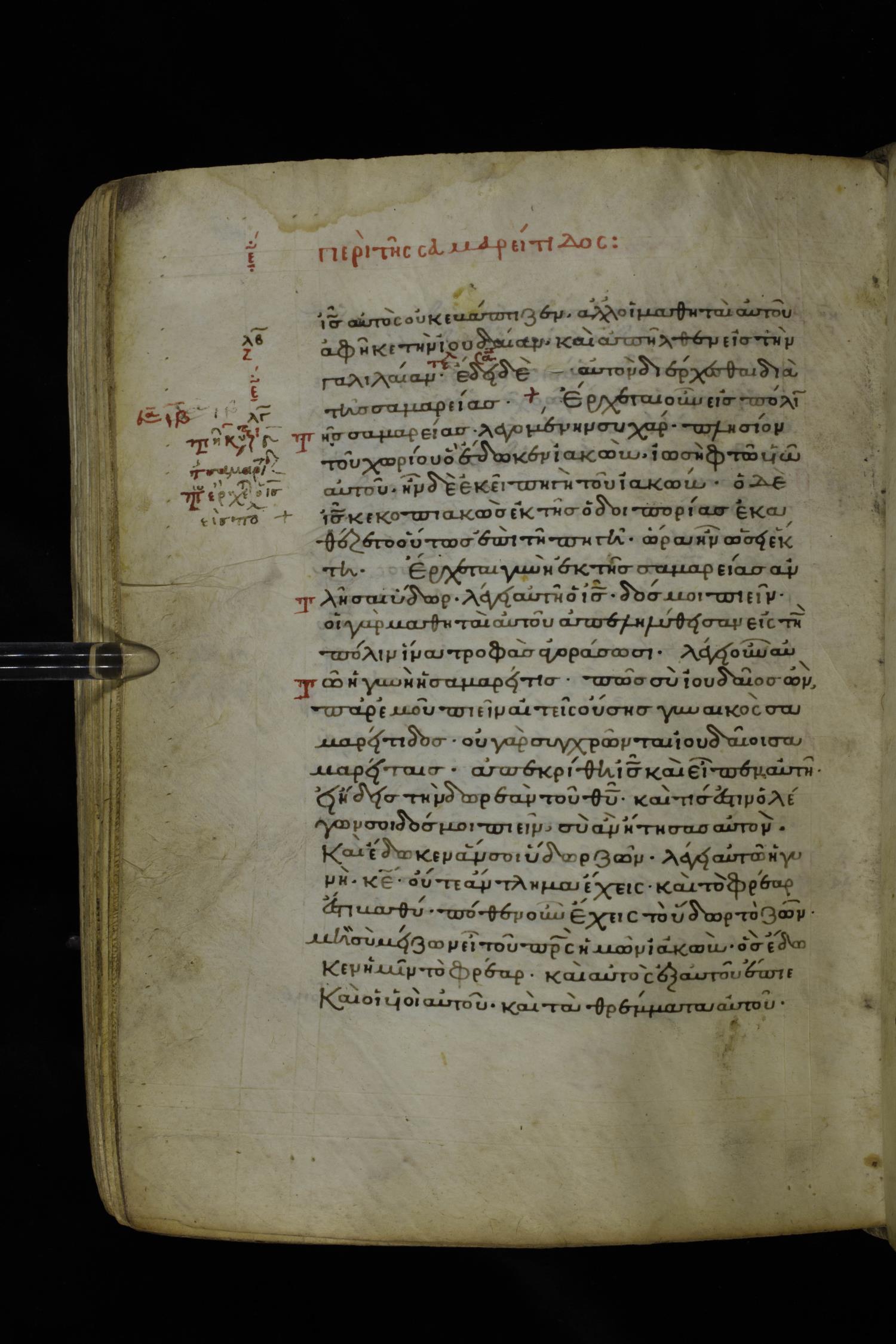 Twelfth century minuscule of the Gospels on parchment; 195 leaves, 1 column, 25 lines per column. Images were taken at the National Library of Greece in Athens.