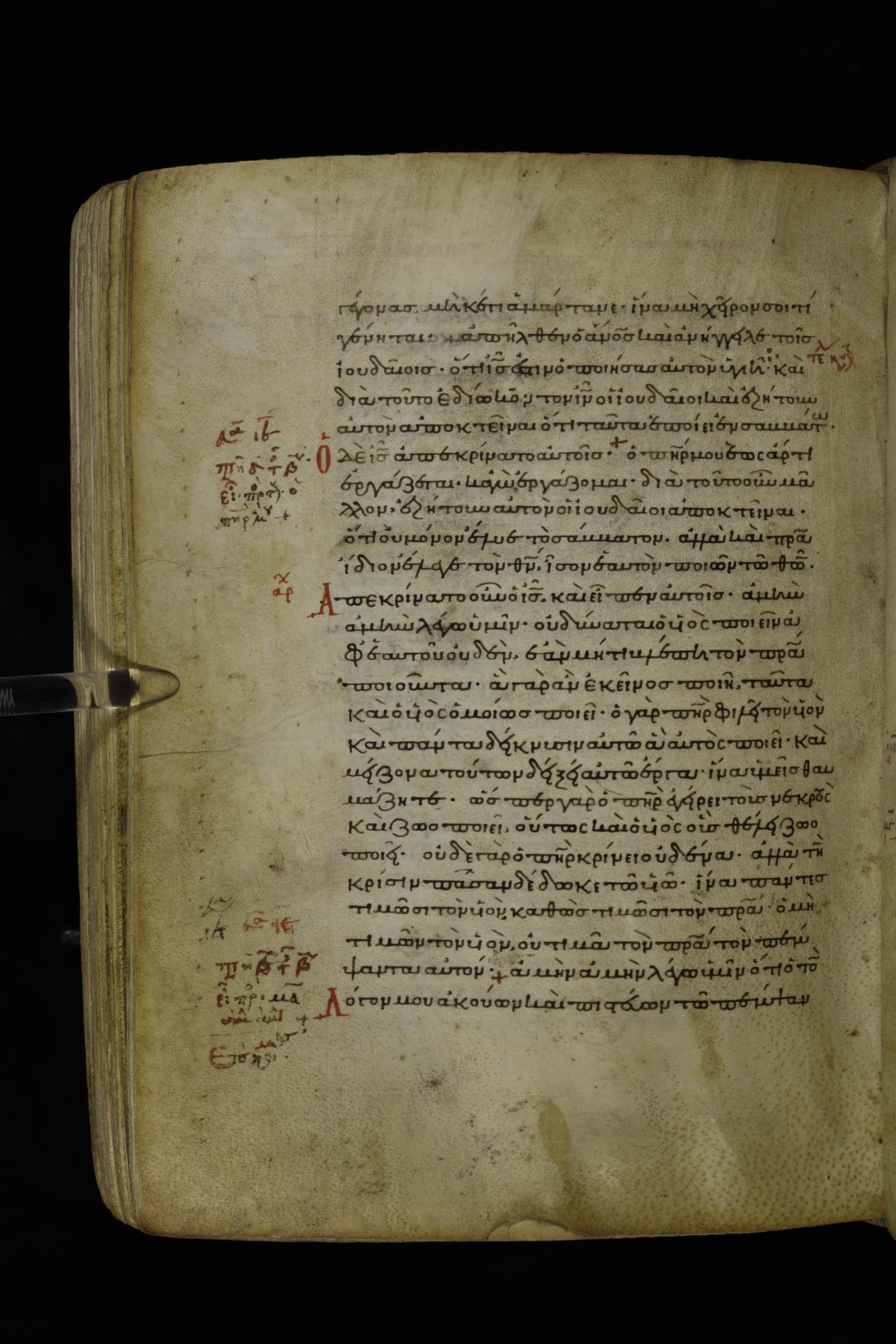 Twelfth century minuscule of the Gospels on parchment; 195 leaves, 1 column, 25 lines per column. Images were taken at the National Library of Greece in Athens.