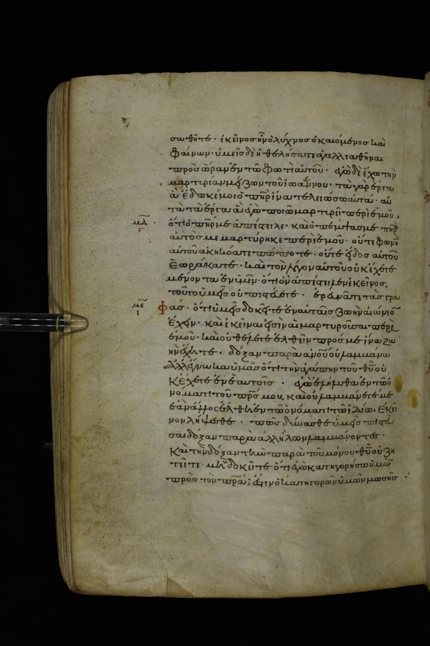 Twelfth century minuscule of the Gospels on parchment; 195 leaves, 1 column, 25 lines per column. Images were taken at the National Library of Greece in Athens.